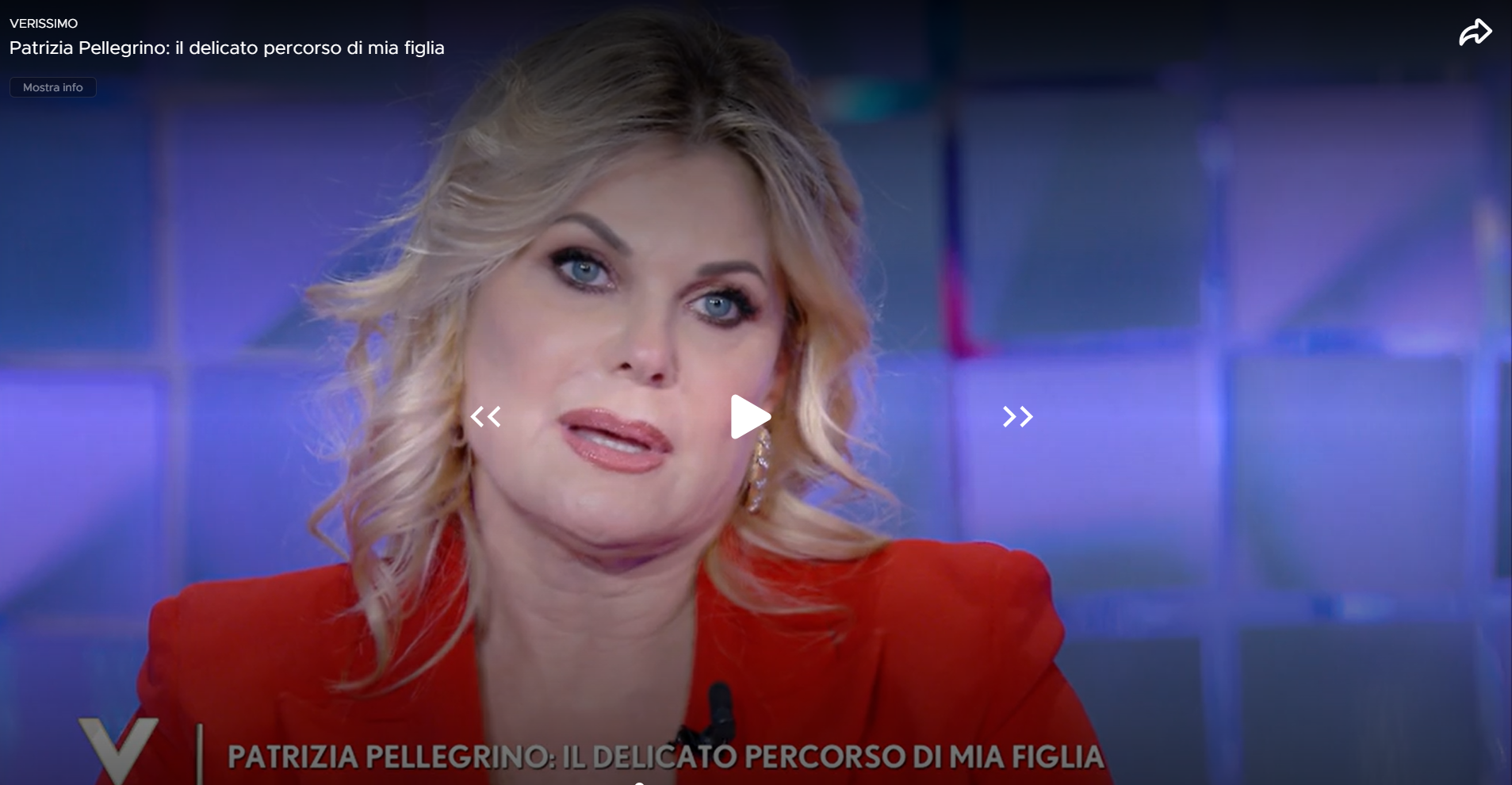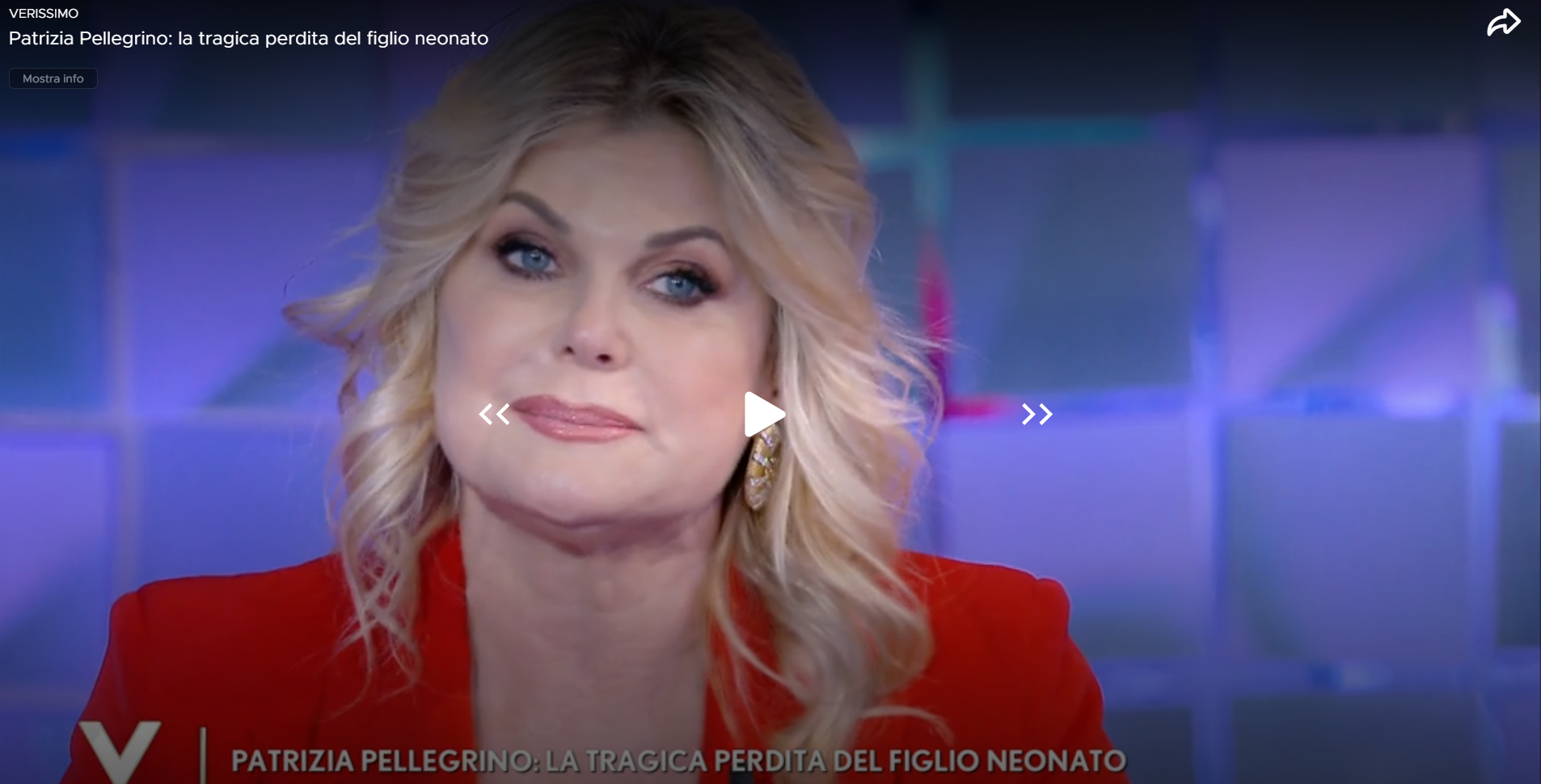 Patrizia Pellegrino è ospite oggi, sabato 8 novembre, a Verissimo. La showgirl - sempre nel salotto di Silvia Toffanin - aveva parlato della sua difficile maternità. Madre di quattro figli, il suo primogenito, Riccardo, è tragicamente scomparso quando aveva appena dieci giorni: "Quando ho perso Riccardo, a pochi giorni dalla nascita, è stato il primo momento davvero difficile della mia vita", ha raccontato l'attrice.
