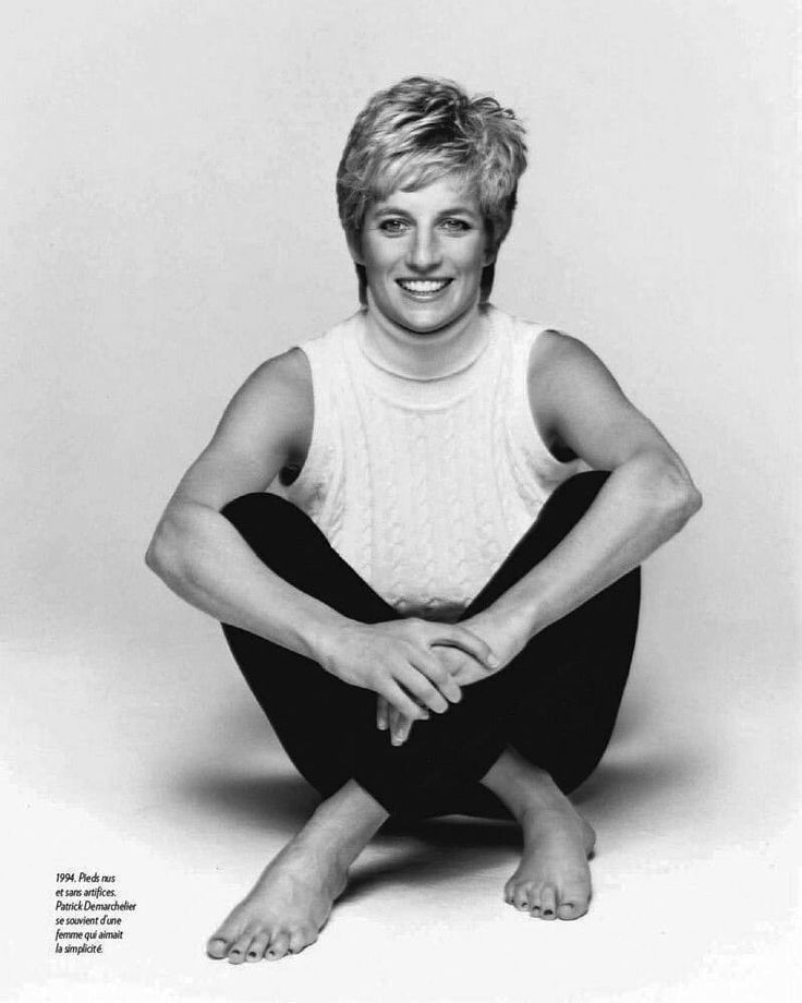L'immagine di Diana sorridente seduta a gambe incrociate con indosso uno smanicato a collo alto bianco e un paio di pantaloni capri neri ha chiaramente ispirato anche lo styling dello scatto di Meghan, contraddistinto da una camicia bianca arrotolata e un paio di pantaloni neri.
