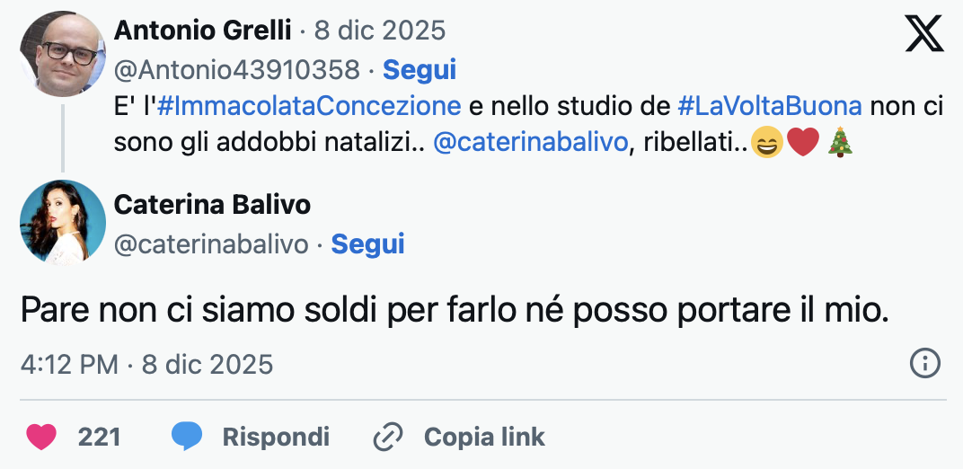 "Oggi è l’Immacolata Concezione e nello studio de La Volta Buona non ci sono addobbi natalizi… Caterina Balivo, ribellati", ha scritto un utente su X. La risposta della conduttrice è arrivata quasi subito: "Pare non ci siano soldi per farlo, né posso portare il mio". A un altro telespettatore che segnalava la stessa anomalia festiva, Balivo ha rincarato la dose: "Perché non ci sono i soldi, così mi è stato detto dal capo autore". Una spiegazione che ha alimentato ulteriormente il dibattito online, tra ironia e stupore.