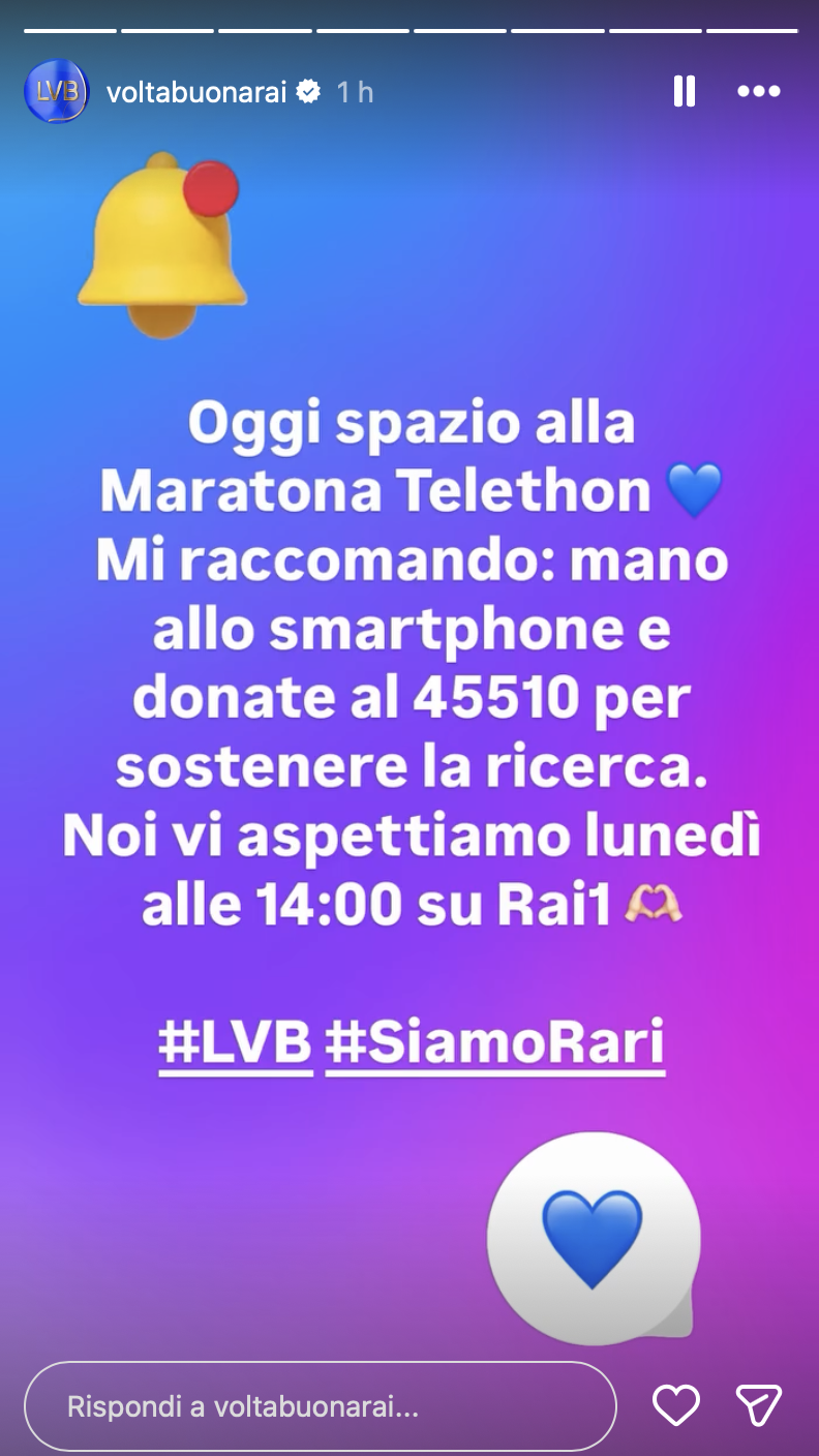 Durante la finestra Telethon che sostituisce La Volta Buona, autori e conduttori invitano il pubblico a sostenere la ricerca inviando un SMS o chiamando da telefono fisso il numero solidale 45510, attivo per tutta la durata della maratona dal 14 al 21 dicembre. Ogni contributo finanzia progetti dedicati a centinaia di malattie genetiche rare, dando voce a pazienti e famiglie che, senza questa rete di solidarietà, rischierebbero di restare senza prospettive di cura.