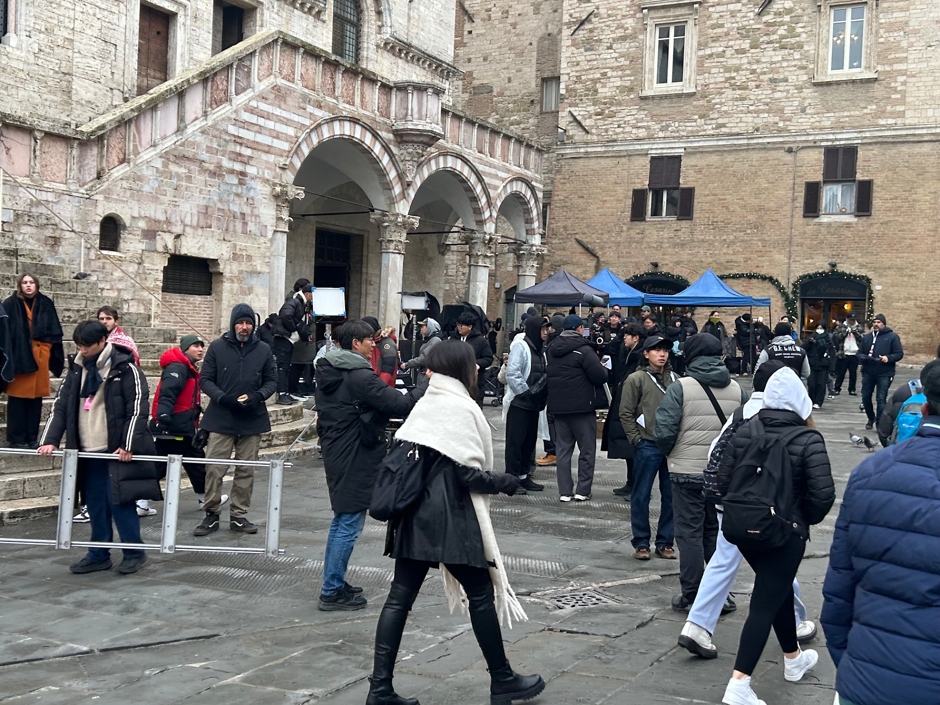 Le stelle del K-drama Kim Seon-ho (nei panni di Ho-Jin) e Go Youn-jung (che interpreta Moo-Hee) di fronte a Palazzo dei Priori. A destra la locandina ufficiale dove appare la Fontana Maggiore