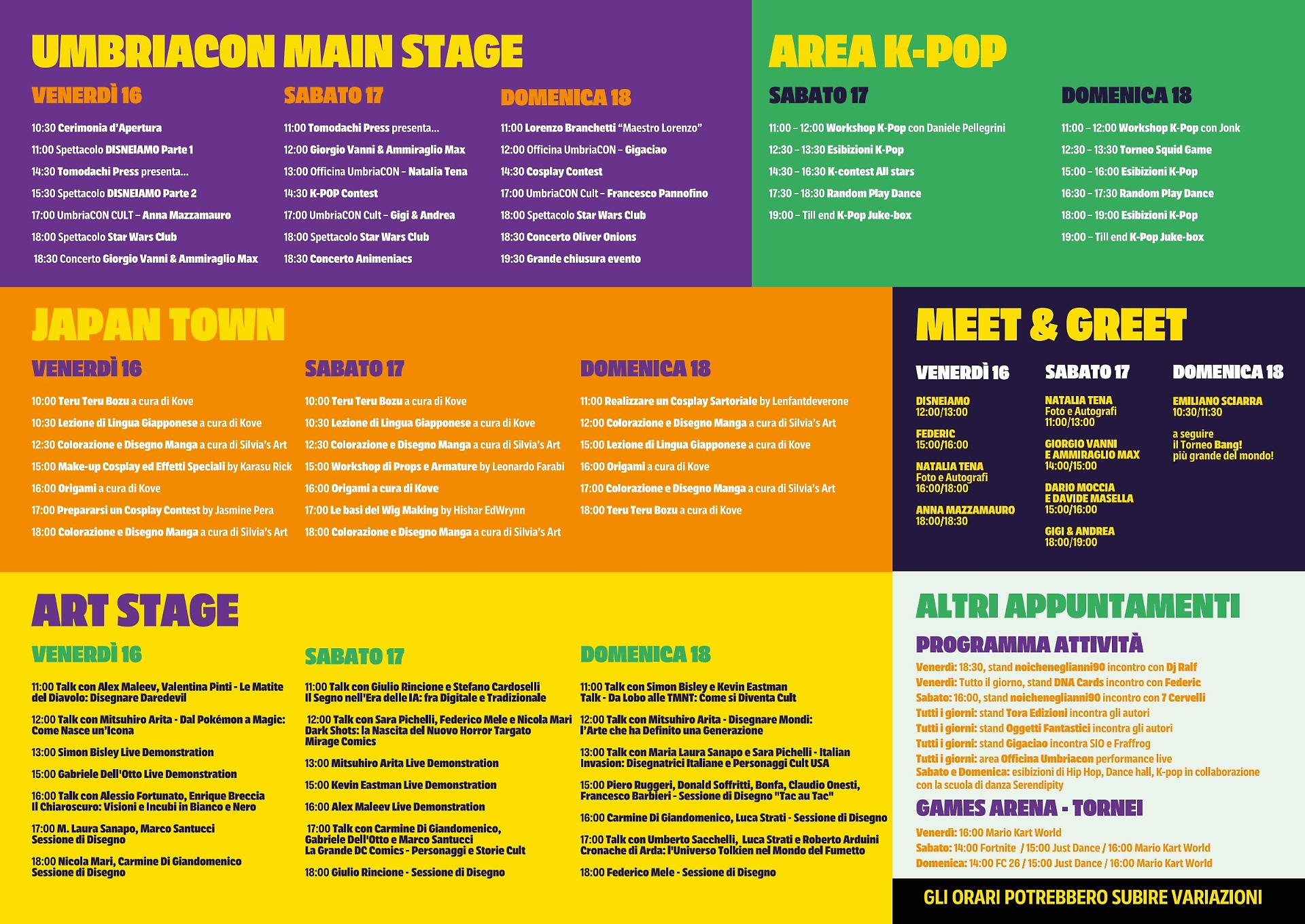 La mattina sarà dedicata in modo particolare all’evento speciale Scuole “UmbriaCON Kidz”, a cui hanno aderito già oltre 300 bambini e ragazzi, con attività, laboratori tematici e lo spettacolo Disneiamo a loro dedicato.
