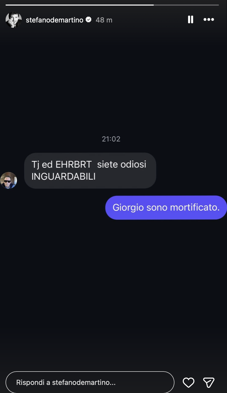 Nel DM mostrato nelle storie si legge il commento dell’utente: "Tu ed Herbert siete odiosi, inguardabili", riferito alla loro presenza fissa nell’access prime time di Rai 1 con Affari Tuoi. De Martino risponde all’istante con un "Giorgio sono mortificato", una formula educata ma palesemente ironica, che segnala distanza emotiva dall’insulto e capacità di non farsi travolgere dal giudizio.