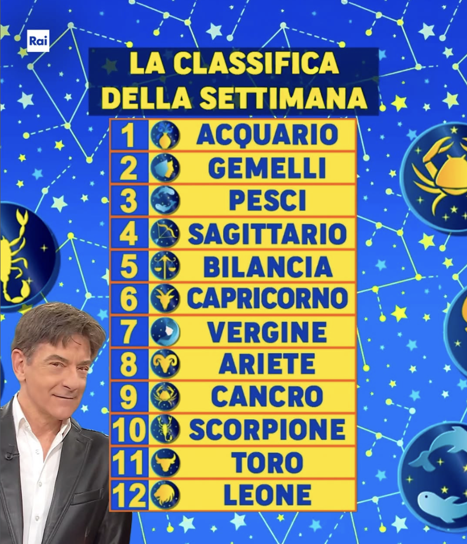 L’Acquario domina la nuova classifica settimanale di Paolo Fox, mentre il Leone chiude la graduatoria dei dodici segni dello zodiaco. La classifica è stata svelata durante l’ultima puntata de I Fatti Vostri su Rai 2 e resta valida per la settimana in corso.