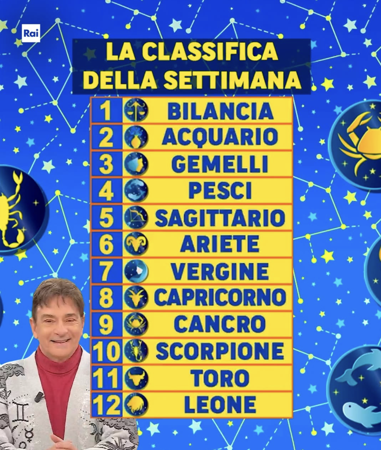 Ecco l’ordine dei dodici segni così come mostrato nella grafica Rai dedicata alla “classifica della settimana” di Paolo Fox: