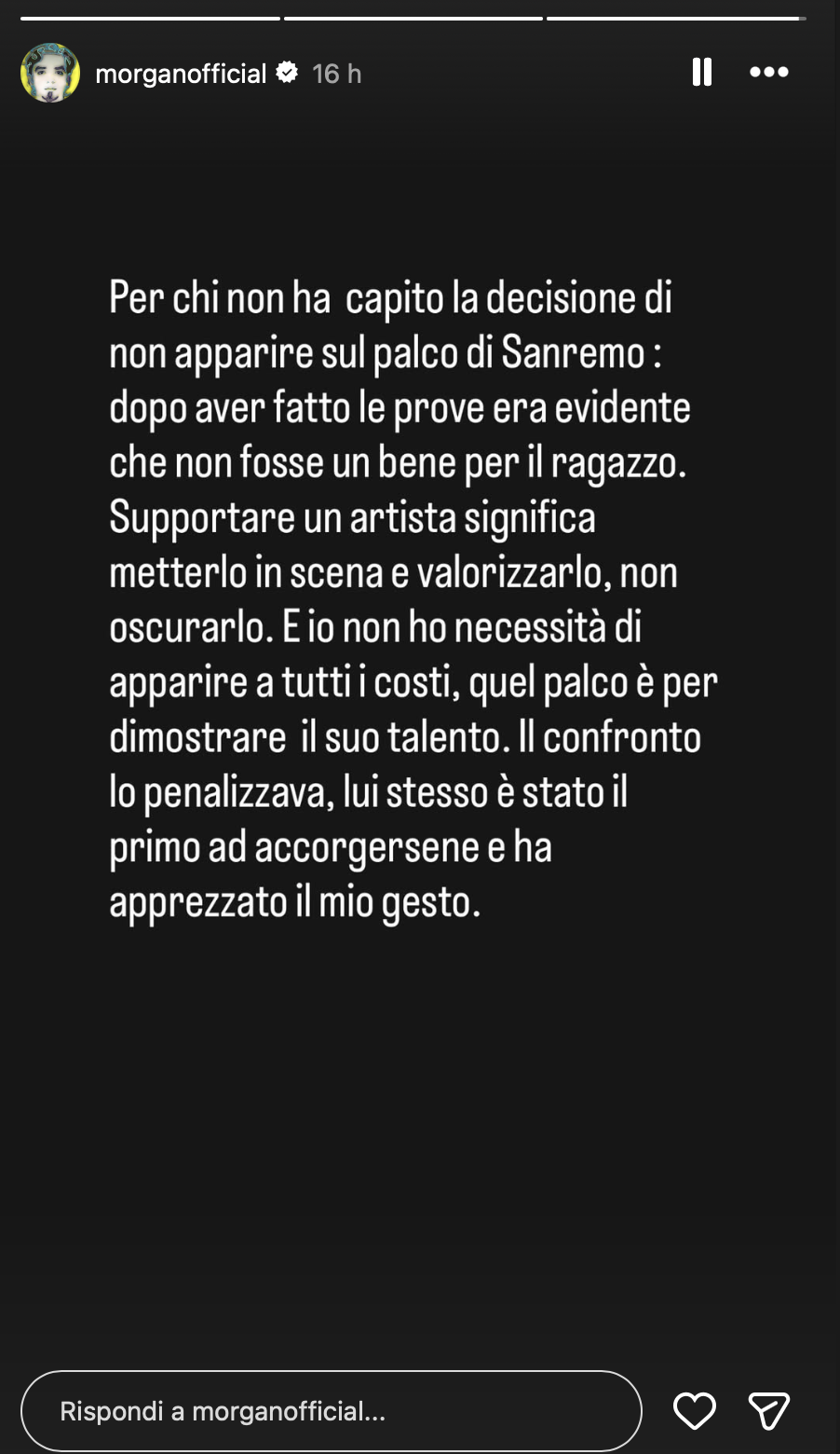 Nelle storie Instagram Morgan ha spiegato il perché del suo passo indietro, rivolgendosi a chi non aveva compreso la scelta di non apparire sul palco dell’Ariston accanto a Chiello. Dopo le prove, scrive: "Per chi non ha capito la decisione di non apparire sul palco di Sanremo: dopo aver fatto le prove era evidente che non fosse un bene per il ragazzo. Supportare un artista significa metterlo in scena e valorizzarlo, non oscurarlo. E io non ho necessità di apparire a tutti i costi, quel palco è per dimostrare il suo talento. Il confronto lo penalizzava, lui stesso è stato il primo ad accorgersene e ha apprezzato il mio gesto".