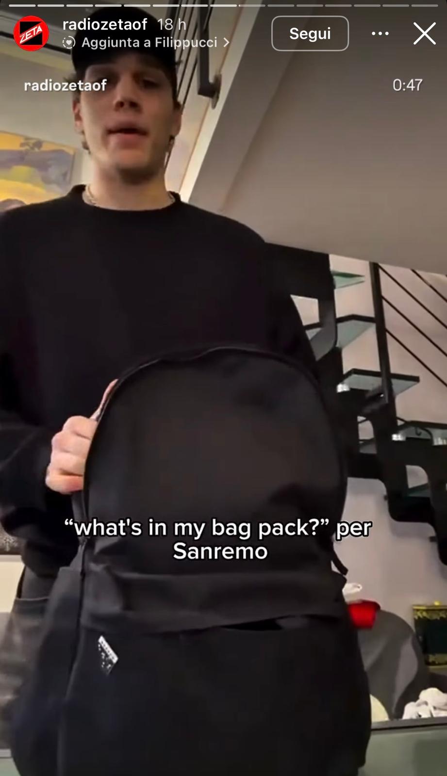 E a proposito di riti scaramantici, il cantante sabato scorso si è impossessato del profilo Instagram di Radio Zeta per condividere con i fan le emozioni pre partenza e mostrare il suo "What's in my bag pack per Sanremo". Il pubblico di giovanissimi già sa, Filippucci non si esibisce mai senza le sue mutande fortunate, e il cantante ne ha approfittato per scherzare su quale fosse il colore del suo fantomatico portafortuna. Tra chi ipotizza il rosso o il nero, l'artista umbro ha continuato a tenere i follower sulle spine e tra tazze di camomilla e partite alla PlayStation, ha cercato di scaricare la tensione pre-gara.