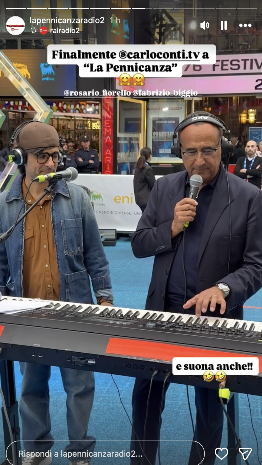Vigilia di Festival e clima già da show: Carlo Conti si è collegato in diretta con La Pennicanza di Fiorello portando con sé il maestro Cremonesi e una tastiera piazzata proprio davanti al Teatro Ariston.
