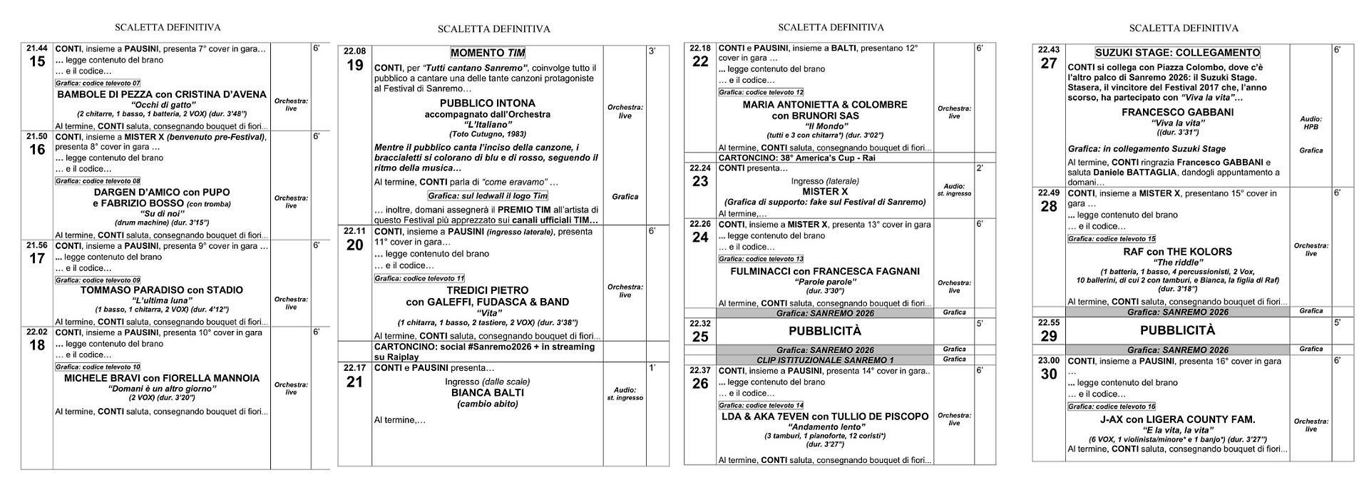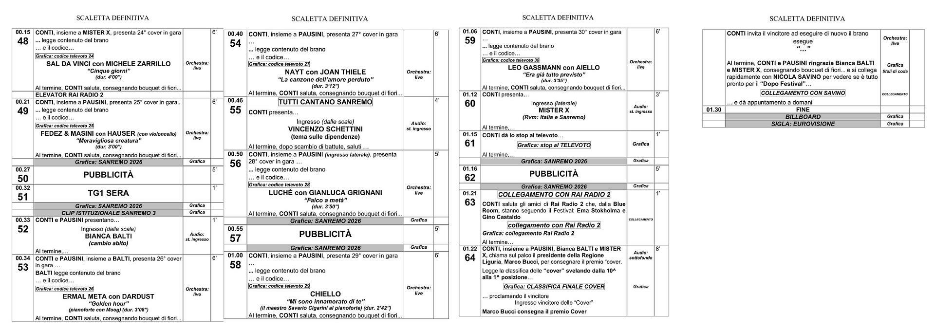 Rai ha pubblicato la scaletta minuto per minuto della serata delle cover, in onda stasera in tv venerdì 27 febbraio. Apertura della kermesse alle 20.40 con con Laura Pausini che attraversa il carpet esterno ed entra in teatro cantando un medley dei suoi successi ("Ritorno ad amare", "Immensamente", "Io canto"). Alle 21.08 farà il suo ingresso il MIster X della serata: proprio in conferenza stampa Carlo Conti ha lasciato la sala anzitempo ("Scusate devo andare perché mi stanno arrivando delle cose e ci saranno delle nuove sorprese", ha detto il direttore artistico senza svelare nulla). Alle 21.24 scende le scale Bianca Balti, co-conduttrice della serata.
