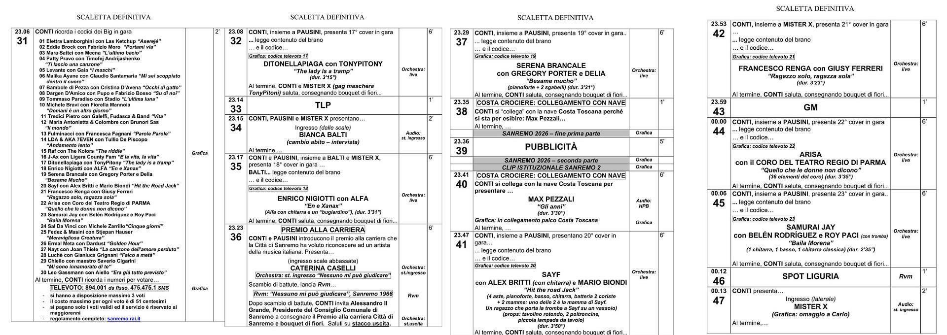 Alle 23.23 la consegna del Premio alla Carriera della Città di Sanremo a Caterina Caselli. Venti minuti più tardi il collegamento con la nave Costa Toscana per l'esibizione di Max Pezzali che canta "Gli anni".