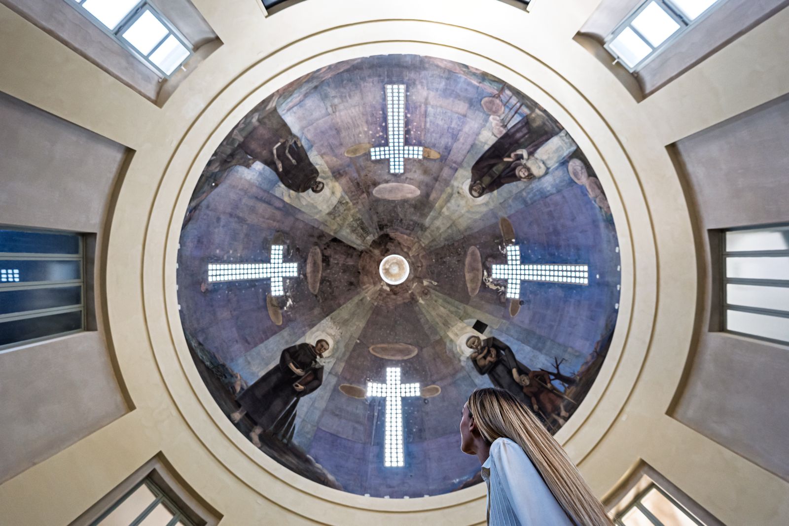 Presentato il progetto di restauro degli affreschi di Gerardo Dottori custoditi all'interno della Cappella Salus Infirmorum dell’ex Policlinico di Monteluce, a Perugia. Le opere del pittore futurista perugino sono pronte a vivere una nuova giovinezza. Realizzate nel 1943, mentre il progetto per la costruzione (iniziata nel 1936 e terminata nel 1943) fu affidato per concorso pubblico all’ingegner Carlo Cucchia nell’ambito dell’ampliamento dell’allora ospedale di Monteluce, raffigurano un ciclo pittorico che, pur mantenendo un linguaggio tradizionale adatto a un luogo di preghiera, integra elementi tipici dell’aeropittura futurista, con scenari lirici e visioni dall’alto del paesaggio umbro.