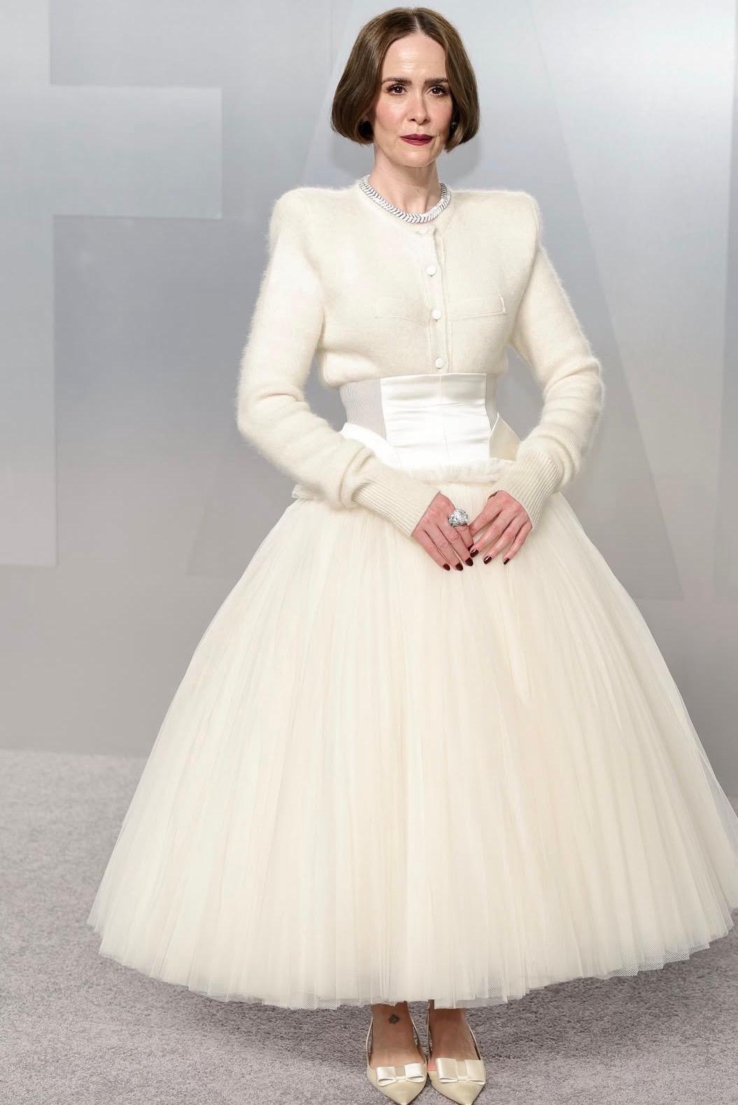 Uno dei look più audaci di questa edizione. La sensualità assume contorni più caustici con Sarah Paulson che sorprende tutti con un abito color crema della collezione prêt-à-porter Autunno/Inverno 2026/27 firmata Matieres Fecales. Il corpetto taglio tailleur con orlo ampio e stretto in vita da una cintura stile bustier abbinata, consacrano il look tra gli indimenticabili di questa edizione.