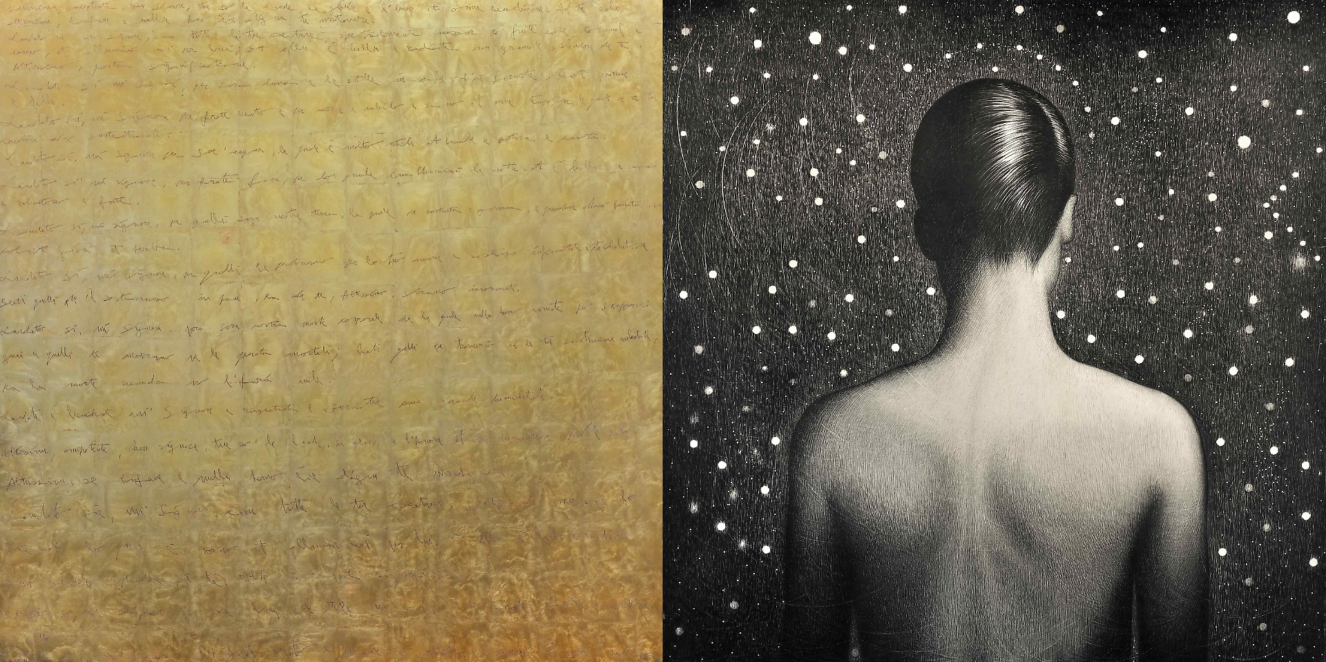L’ormai celebre Venere degli stracci di Michelangelo Pistoletto è una riflessione sull’equilibrio tra natura e artificio presente; Emilio Isgrò si è confrontato direttamente con il Santo, applicando le sue note cancellature concettuali, che non vietano o distruggono ma proteggono le parole, anche al Cantico delle Creature; come pure il dittico In Lumine Dei di Omar Galliani è un omaggio diretto al Cantico, inciso sulla superficie dorata di una delle due tavole a cui si accosta una figura di donna di spalle in un’opera che si interroga sull’esperienza del divino e in cui, come nel dettato francescano, la luce non è oggetto di contemplazione, ma presenza diffusa che attraversa ogni forma del vivente, rendendo il corpo spazio di risonanza, di accoglienza e di possibile manifestazione del sacro.