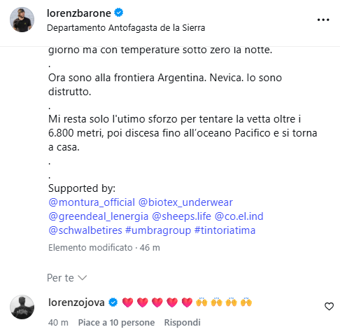 Su Instagram, tra le centinaia di reazioni sotto il post di aggiornamento, spunta un commento di Lorenzo Jovanotti, che già in passato aveva mostrato il suo supporto alla missione di Barone.