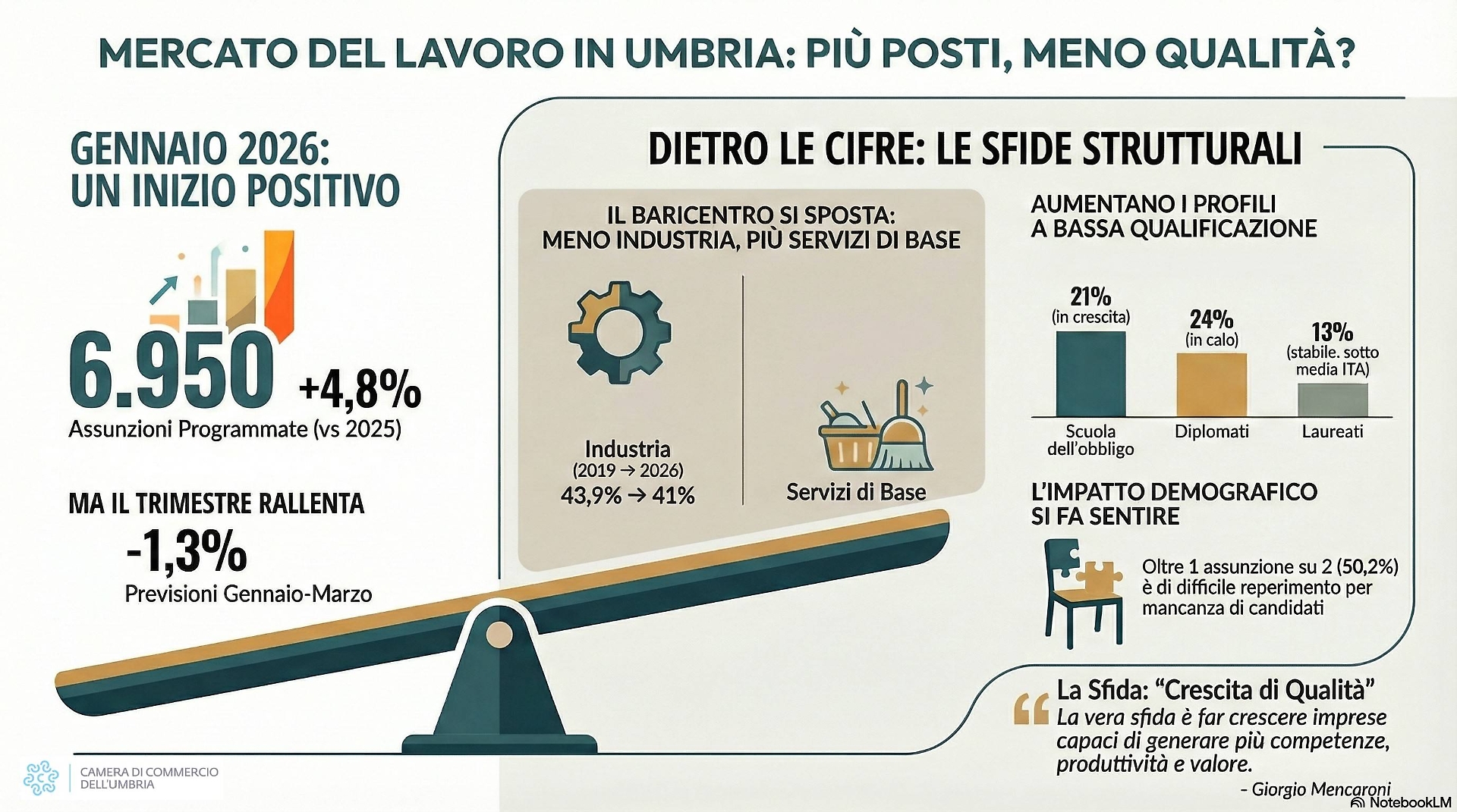 Ma il bicchiere è mezzo pieno? Nello stesso mese di gennaio 2026 in Umbria la quota di assunzioni rivolte a persone con solo la scuola dell’obbligo o senza titolo sale dal 19% al 21%, lo stesso livello della media nazionale. “Nello stesso periodo - prosegue la Camera di commercio - la richiesta di diplomati scende dal 26% al 24% (ma è notevole la quota di avviamenti al lavoro programmati che riguardano le persone dotate di qualifica o diploma professionale) mentre quella di laureati resta intorno al 13%, contro il 17% dell’Italia. Quest’ultimo dato è coerente con quella ‘crescita senza qualità’ in cui sembra intrappolata l’Umbria. È un fenomeno che riguarda varie aree dell’Italia, ma che in una regione piccola e manifatturiera come l’Umbria pesa di più sulla capacità di salire di livello nelle filiere produttive”, è riportato nel dossier. Altro dato non positivo: dopo gennaio le previsioni sembrano scemare. “Se si allarga lo sguardo all’intero trimestre, il quadro si ridimensiona. Le assunzioni previste scendono da 18.090 a 17.850, con una riduzione di 240 unità pari al –1,3%”. Non si tratta di una crescita “solida e continuativa”.