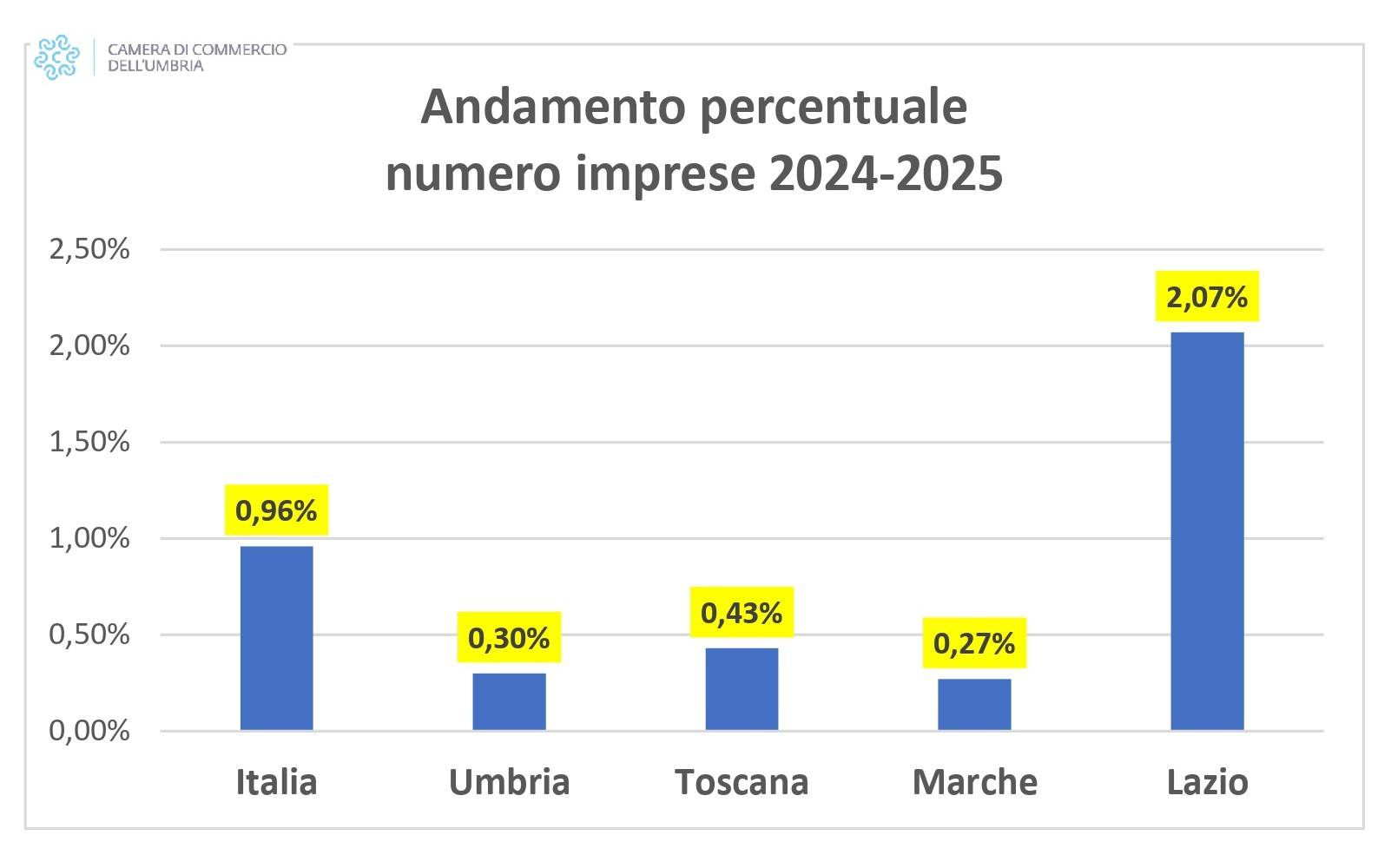 Crescono le imprese in Umbria, però a rilento rispetto al resto d'Italia, mentre prosegue la crisi del commercio. E' quanto emerge dal report Movimprese di Infocamere, su dati della Camera di commercio dell'Umbria. Partendo dai dati che riguardano le imprese, se ne contano 273 in più nel 2025. Una crescita dello 0,3%, a fronte di una media nazionale dello 0,96%. Il risultato, pur positivo dopo il segno meno del 2024 (-0,36%), secondo la Camera di commercio dell'Umbria "conferma una dinamica più debole rispetto al quadro italiano, che nello stesso periodo registra un saldo attivo dello 0,96% (+56.599 imprese), oltre al triplo rispetto all’Umbria. Nella graduatoria nazionale l’Umbria si colloca al 14° posto su 20 regioni. Nel Centro Italia il risultato non è il peggiore, ma resta inferiore a quello di Toscana (+0,43%) e soprattutto Lazio (+2,08%), mentre le Marche si fermano a +0,27%".