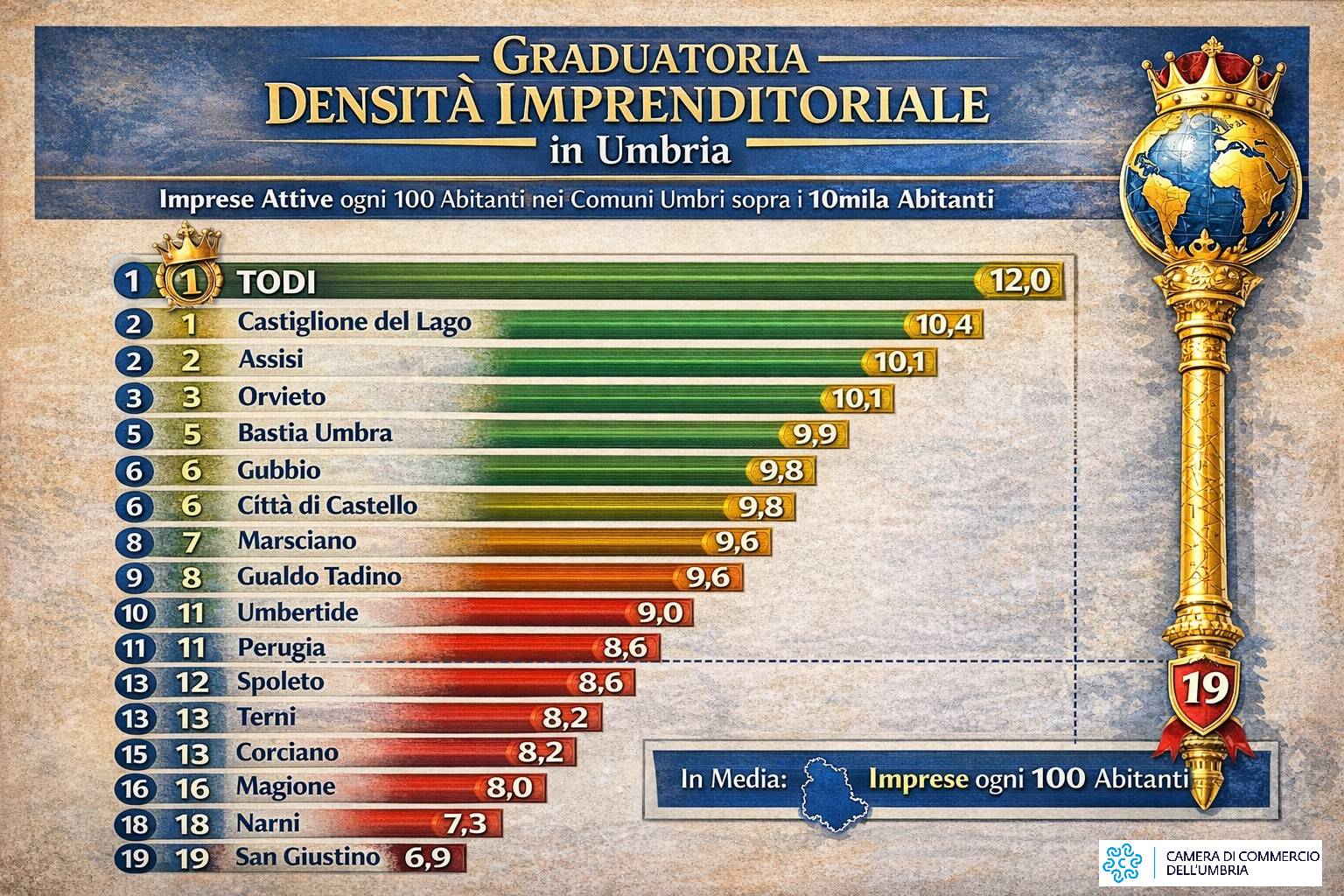 Nella fascia più rilevante – quella dei comuni con almeno 10mila abitanti, dove si concentra la parte più consistente della popolazione e dove anche la dimensione media delle imprese (numero di addetti per azienda) è più elevata – lo Scettro dell'Imprenditorialità quest’anno va ancora a Todi con 12 imprese attive ogni 100 abitanti. Un dato che lo pone nettamente davanti a Castiglione del Lago (10,4), Assisi e Orvieto (10,1). Completano la “Top Ten” Bastia Umbra (9,9), Gubbio e Città di Castello (9,8), seguite da Gualdo Tadino, Marsciano (10,6) e Umbertide (9,0).