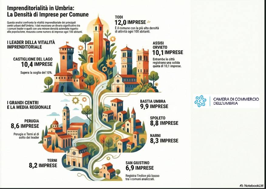 In coda alla graduatoria si collocano San Giustino (6,9 imprese ogni 100 abitanti), Amelia (7,9), Magione (8,0), Terni e Corciano (8,2). Tra gli altri municipi sopra i 10mila abitanti Spoleto presenta 8,8 imprese ogni 100 abitanti, Foligno 8,6 e Narni 8,3.