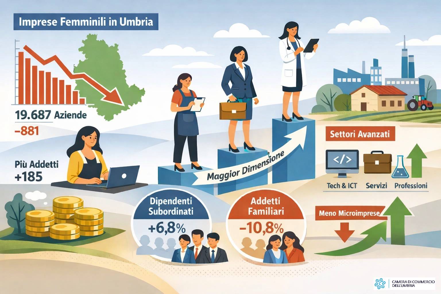 A fronte della diminuzione delle imprese, l’occupazione complessiva segna +185 addetti, pari al +0,4% tra il 2019 e il 2025. Un segnale importante "perché indica che il sistema non si è semplicemente ridotto: si è riorganizzato". Passando poi al secondo elemento chiave: la dimensione media delle imprese femminili umbre sale da 2,6 a 2,7 addetti per impresa, con un aumento del 4,8%, sostanzialmente in linea con il dato italiano, pari al +4,9%. "Non basta ancora per colmare il divario con la media nazionale, che resta più alta, ma mostra con chiarezza una traiettoria di consolidamento", prosegue la nota.