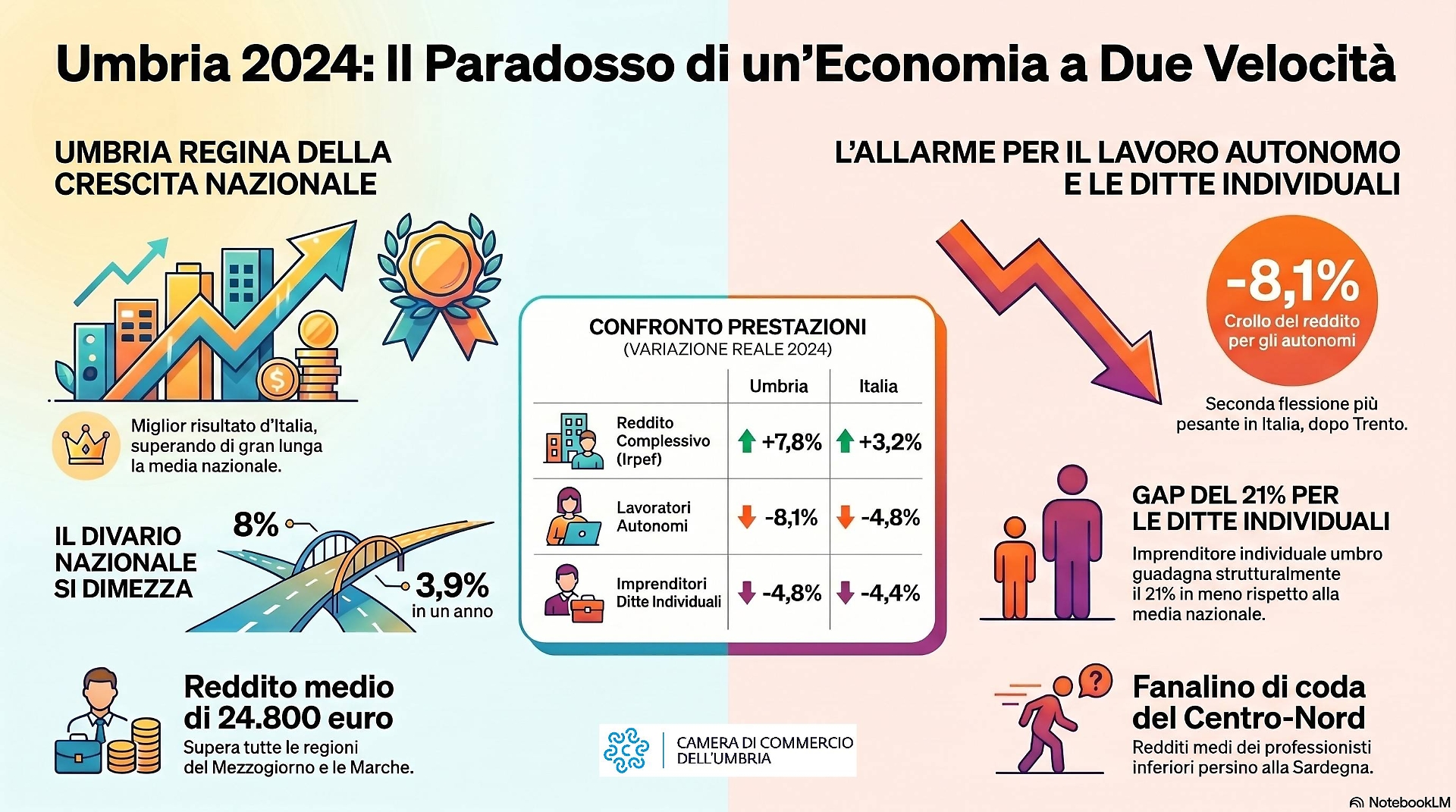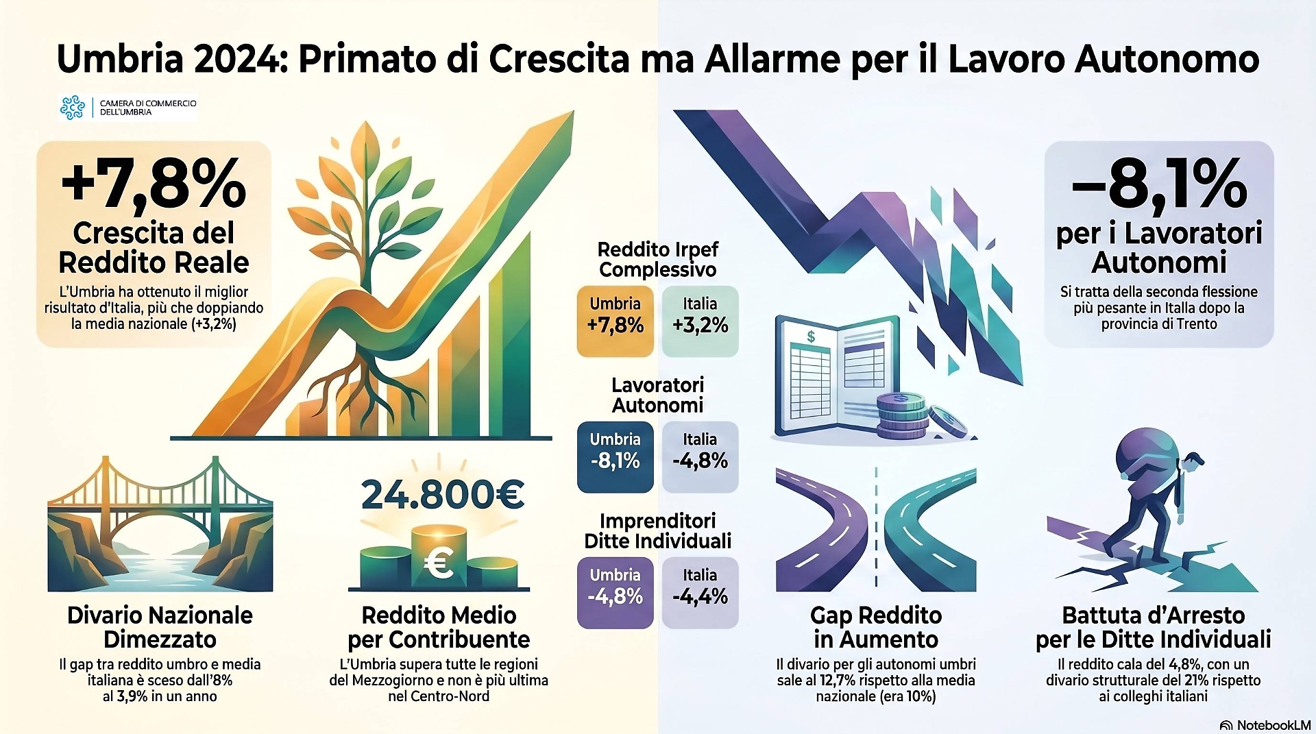 L’Umbria accelera, ma non in tutte le sue componenti economiche. I nuovi dati sulle dichiarazioni dei redditi Irpef 2025, relativi all’anno d’imposta 2024 e diffusi dal ministero dell’Economia e delle Finanze, restituiscono infatti un quadro a due velocità: da un lato una crescita complessiva dei redditi tra le più alte d’Italia, dall’altro una netta frenata del lavoro autonomo e delle imprese individuali, che interrompono il percorso di recupero rispetto alla media nazionale.