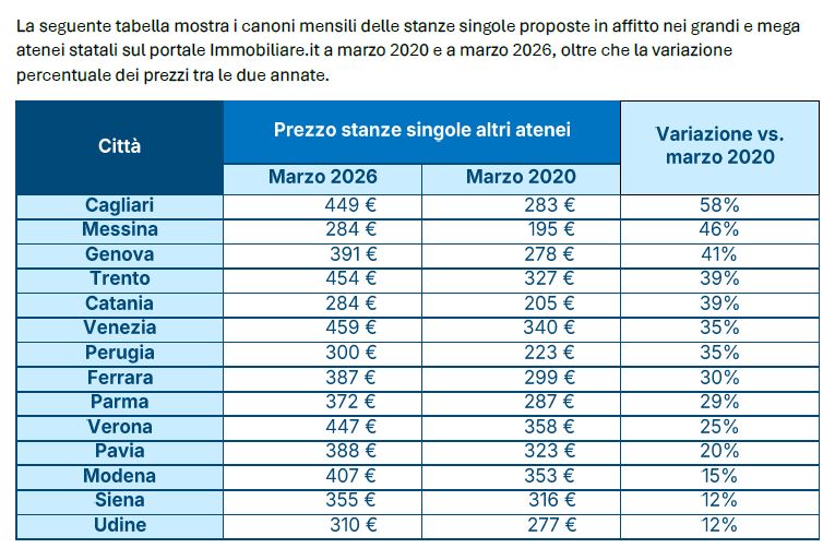 Nonostante l’aumento, Perugia continua a distinguersi per la sua convenienza. Con un canone medio di 300 euro al mese a fine marzo 2026, il capoluogo umbro si posiziona tra le città universitarie meno costose d’Italia per l’affitto di una stanza singola. Solo Messina e Catania, entrambe con 284 euro mensili, presentano valori inferiori.