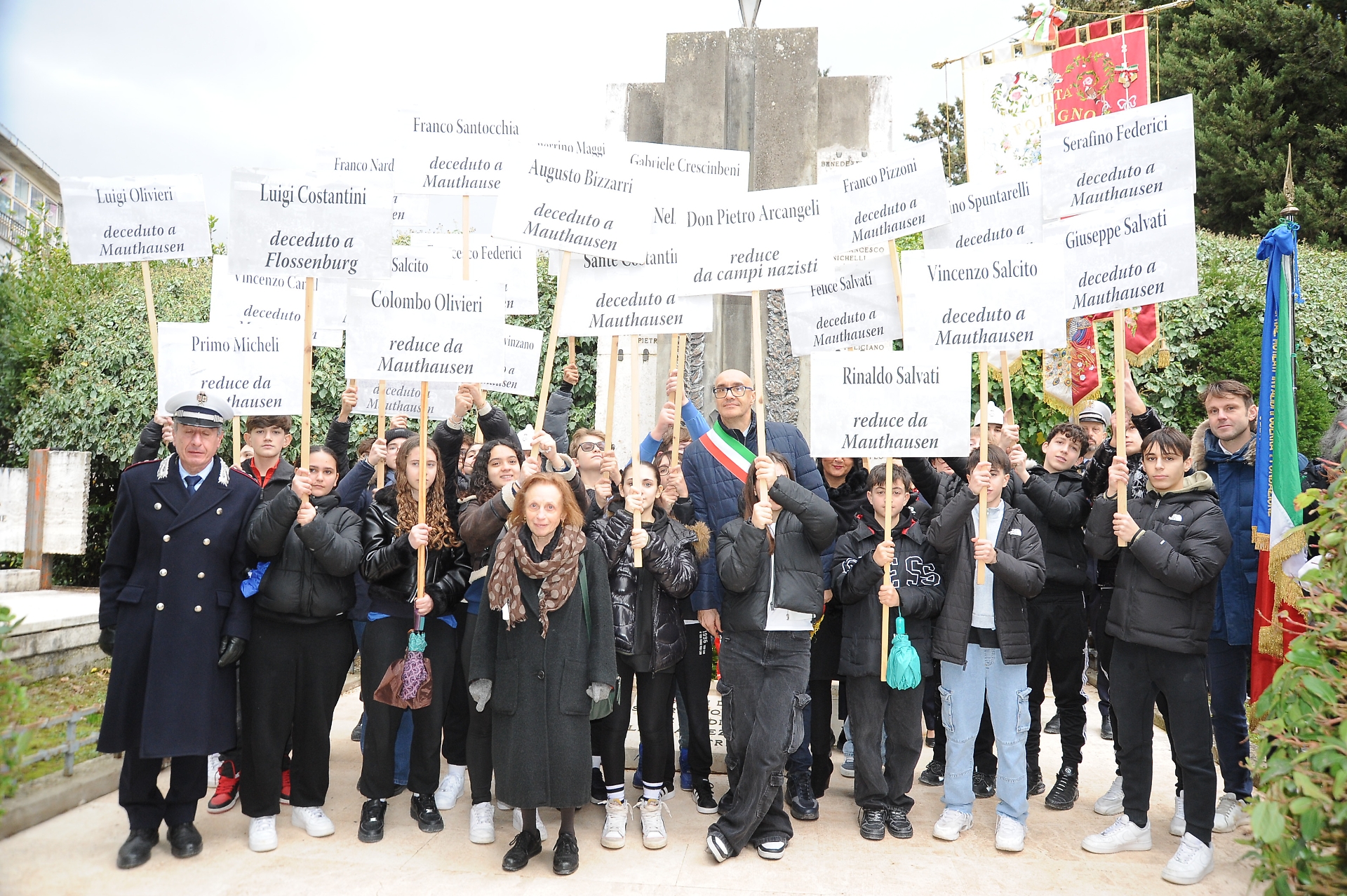 Il momento più toccante della mattinata è giunto in chiusura. Dopo il minuto di silenzio, rotto solo dalle note del silenzio d'ordinanza alla presenza delle massime autorità civili, militari e religiose, gli studenti dell'istituto comprensivo Galileo Galilei di Sant'Eraclio hanno dato vita a un omaggio simbolico. I ragazzi hanno esposto dei placards, ognuno dei quali riportava il nome di uno dei deportati. Un gesto semplice ma potente, che trasforma i nomi sulla lapide in volti e storie da difendere dall'oblio.