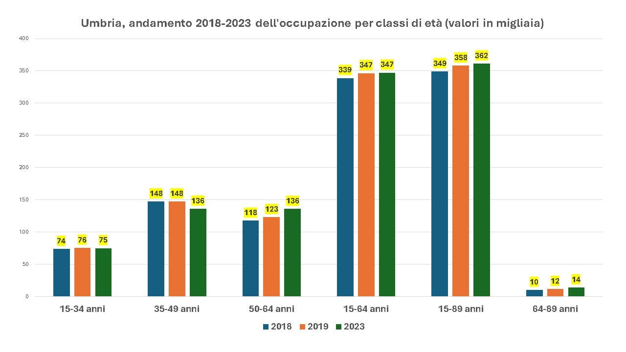 In valori assoluti, i dati umbri evidenziano che: gli under 35 occupati sono aumentati di appena mille unità, da 74.000 nel 2018 a 75.000 nel 2023, non compensando l’aumento complessivo degli occupati; gli over 50, invece, sono cresciuti da 128.000 nel 2018 a 151.000 nel 2023, rappresentando quasi tutto l’incremento complessivo dell’occupazione, che è passata da 349.000 a 362.000 unità.