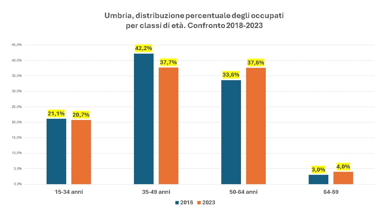 In Umbria, negli ultimi cinque anni (il dato ventennale c’è solo per l’Ialia e le circoscrizioni, non per le regioni) il fenomeno del calo dell’occupazione giovanile si riflette in modo più marcato rispetto alla media nazionale. I giovani under 35, nel 2018, rappresentavano il 21,1% dell’occupazione totale; nel 2023, la loro quota è scesa al 20,7%. Per quanto riguarda la fascia 35-49 anni, la quota di occupati è diminuita dal 42,2% del 2018 al 37,7% del 2023. Gli over 50 sono aumentati dal 39,6% al 41,6%, con i lavoratori tra i 50 e i 64 anni che sono passati dal 33,6% al 37,6%, mentre gli over 64 sono cresciuti dal 3% al 4%.