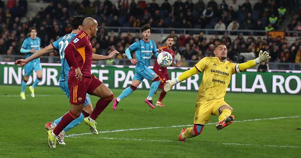 ROMA (ITALPRESS) - La Roma torna a vincere e aggancia di nuovo il quarto posto della classifica della Serie A. A sette giorni dal tonfo di Udine, i giallorossi stendono il Cagliari per 2-0, in casa, e raggiungono a quota 46 la Juventus, fermata sul 2 pari dalla Lazio ieri. In tribuna c'è anche Francesco Totti, al centro delle cronache dopo l'apertura di Claudio Ranieri per un suo ritorno in società. Gasperini lancia Pisilli dall'inizio e in attacco sceglie Pellegrini con Soulé e Malen. Per Pisacane assente Mina in difesa; davanti tridente Palestra-Kilicsoy-Esposito. La Roma fa la partita fin dai primi minuti. Al 18' Caprile rischia una clamorosa autorete, prima di recuperare il pallone sulla linea e salvarsi all'ultimo. Si cercano gli inserimenti di Malen alle spalle dei difensori ospiti. Un piano che dà i suoi frutti al 25', quando Mancini verticalizza sul centro-destra per l'olandese, bravo a bruciare il suo avversario, entrare in area e scavalcare Caprile con un pallonetto morbido per l'1-0. Il Cagliari, che nei primi minuti aveva provato a dire la sua, non si vede più fino all'intervallo. Il copione della ripresa è lo stesso dei primi 45 minuti. Si vedono poco gli ospiti, mentre la Roma tiene il pallone in attesa della giusta chance. Gasperini decide che è il momento dell'esordio per Zaragoza, che al 57' fa il suo ingresso accolto dal boato dell'Olimpico. L'uomo della serata, però, è sempre Donyell Malen, che dopo una serie di occasioni trova il raddoppio al 65'. Un ottimo Pisilli recupera palla sulla destra e serve Celik, che avanza e mette in mezzo, dove l'olandese si avventa sulla sfera e la spinge in rete. Il neo acquisto del reparto offensivo capitolino fa in tempo a sfiorare la tripletta in un paio di occasioni, prima di venire richiamato in panchina da Gasperini. Per il Cagliari c'è poco da fare. Al 78', la traversa di Sulemana è l'ultimo vero tentativo dei sardi. All'Olimpico finisce 2-0. La Roma raggiunge la Juventus in zona Champions; il Cagliari rimane a quota 28 e si ferma dopo tre successi consecutivi in campionato. - foto Ipa Agency - (ITALPRESS). pdm/red 09-Feb-26 22:45
