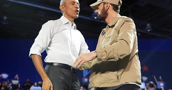 Eminem ha poi chiamato sul palco un grande protagonista della politica americana. Barack Obama ha salutato e abbracciato il rapper tra gli applausi della folla, improvvisando anche un piccolo freestyle sulle note di Lose Yourself.