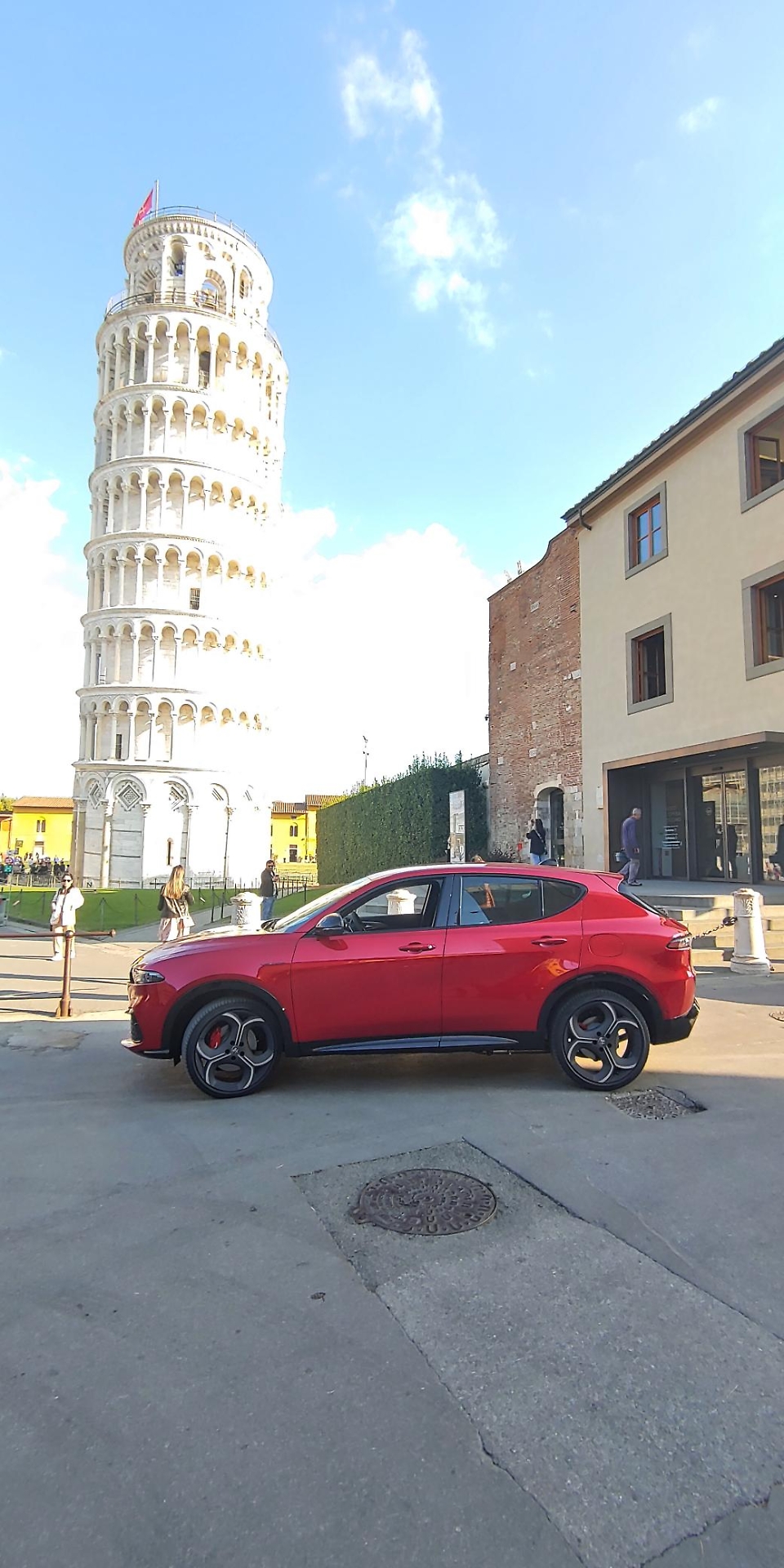 Noi abbiamo testato una top di gamma, una plug-in da 270 Cv in allestimento Veloce, con cerchi da 20 pollici. L’auto parte in elettrico, poi si può scegliere e visto che ci siamo diretti verso il centro di Pisa, abbiamo deciso di proseguire in elettrico. L’auto ha ammortizzatori, che sono di tipo elettronico, settabili in posizione sportiva, o in modalità comfort. Arriviamo quasi vicino alla torre, poi torniamo indietro e mettiamo in ibrido, il termico si accende, facciamo un po’ di chilometri, la guida è sempre fluida. Mettiamo in Dinamic e l’auto cambia letteralmente volto, diventa una vera bestiaccia. Schiacciando sull’acceleratore, la Tonale si proietta in avanti come una scheggia e le quattro ruote sembrano volersi aggrappare al terreno. Non si nota più quel ritardino nell’inserimento dell’elettrico, che aziona le ruote posteriori. Carreggiate, nuovo assetto, nuovi software: un cocktail perfettamente riuscito, che ha generato un’auto nuova. Completa e non troppo invasiva la dotazione Adas, che comunque ha proiettato la Tonale a livello di 5 stelle Euro NCAP, per un livello 2 di guida assistita e che comprende: Cruise Control Adattivo con Lane Centering, Traffic Jam Assist, Blind Spot Detection, Rear Cross Path Detection, Driver Attention Monitoring, sistema di riconoscimento della segnaletica stradale con Intelligent Speed Assist e frenata automatica d’emergenza con rilevamento pedoni e ciclisti. Non mancano: la telecamera a 360° ad alta risoluzione con visione “drone view” e il parcheggio semi-automatico.