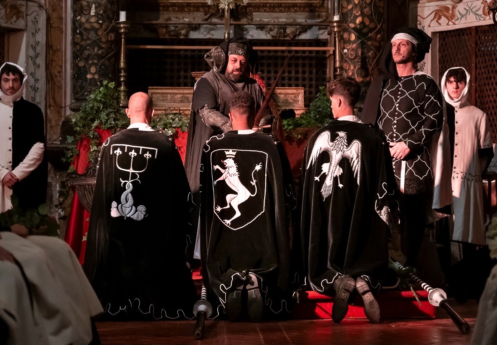 Il corteo, che quest'anno vuol celebrare in particolar modo i colori del Terziere e dei tre cavalieri che durante tutto l'anno si allenano con impegno e passione per difendere il vessillo bianconero il giorno della gara equestre, sarà composto dai musici, dal porta gonfalone, dalla dama degli anelli, che per l’occasione sarà impersonata da Barbara D’Erasmo, con le sue ancelle, dai porta lance, dal capo priore Cesare Antonini, dal cerimoniere e dal priore Simone Galletti. La cerimonia, secondo rito tradizionale, sarà raccontata da due narratrici. Al tradizionale lavaggio delle mani, seguirà poi il gesto del capo priore che poserà la spada sulla testa di Tommaso Finestra, Luca Chitarrini e Mattia Zannori incoronandoli cavalieri. Sarà poi la volta della “vestizione” degli stessi che spetterà alla dama degli anelli, con mantelli, speroni e lance, fino ad arrivare alla preghiera di giuramento dei cavalieri e ai doni portati dalle ancelle consistenti in un giglio (simbolo di purezza) e una spada (simbolo di fermezza e della stessa cerimonia di investitura). Al termine, il corteo sfilerà fino al Duomo per la tradizionale offerta delle rose al patrono San Giovenale.