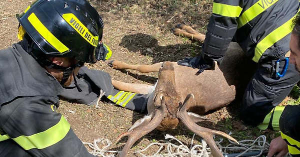 Il daino tratto in salvo dai vigili del fuoco
