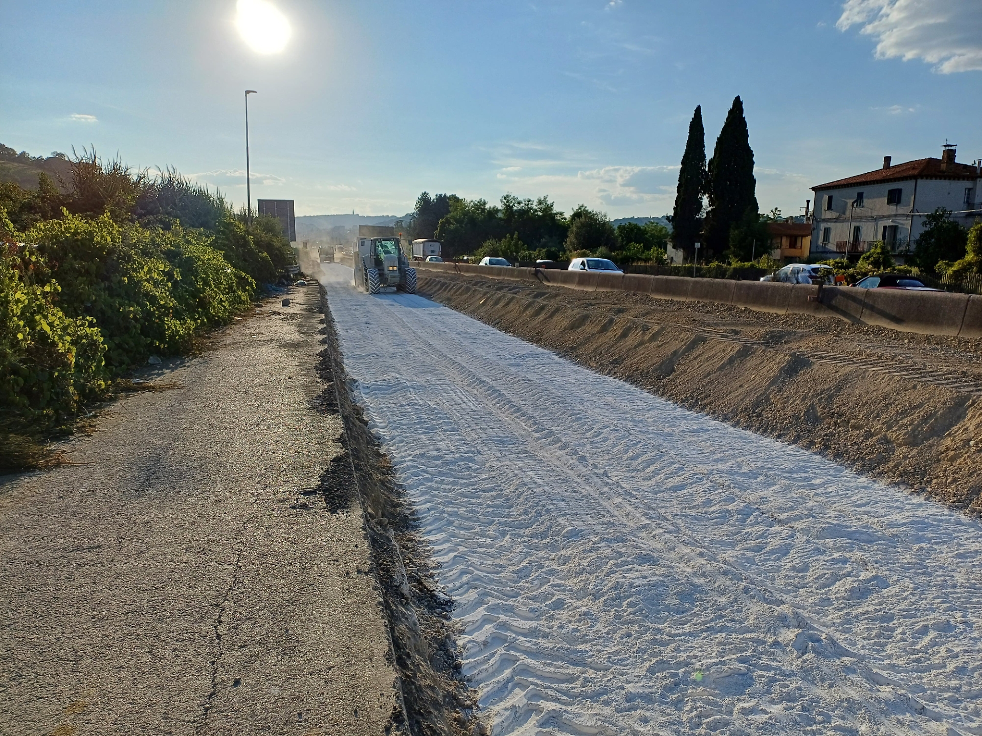 Nello specifico, i lavori hanno riguardato la completa rimozione della vecchia pavimentazione, il miglioramento degli strati di fondazione fino a oltre 1 metro di profondità e la realizzazione di un nuovo piano viabile con asfalto drenante, oltre al rifacimento delle opere idrauliche e della segnaletica orizzontale. Tali modalità di intervento consentono un innalzamento degli standard di sicurezza stradale e una lunga durata delle opere nel tempo. Sono stati impiegati oltre 40 mezzi di cantiere tra frese, finitrici, escavatori e mezzi speciali per la stabilizzazione delle fondazioni (pulvimixer) ed oltre 80 operatori specializzati tra operai e tecnici che si sono alternati su più turni per garantire lavorazioni 24 ore su 24, 7 giorni su 7. Oltre 100 mezzi pesanti e altrettanti autisti hanno poi trasportato 16mila tonnellate di materiale, tra quello vergine in arrivo e quello vecchio da smaltire. Circa 14mila metri cubi di materiale sono stati invece lavorati sul posto per la bonifica delle fondazioni e il riciclaggio a freddo dello strato di base. Con il completamento di questo cantiere si superano i 280 chilometri di carreggiata risanati da Anas lungo la E45, pari al 92% del totale, nell'ambito del piano di riqualificazione della principale infrastruttura stradale umbra.