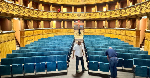 Poltrone blu e stucchi dorati si rivede illuminato il Teatro del Pavone di Perugia. Proseguono, infatti, i lavori all’interno in vista della pre apertura programmata a ottobre (la riconsegna ufficiale alla città avverrà nel 2025). In questi giorni è stato restaurato l’arredo fisso della hall, oltre alle porte, ed è in corso la ricollocazione di tutti gli arredi fissi e mobili dei palchi (dopo il recente completamento della ripavimentazione) e della platea. A occuparsi della pre-apertura nell’autunno-inverno sarà la Teatro Pavone srl. La società è composta per la gran parte da storiche famiglie perugine, da immobiliaristi e il 4% è la quota che detiene il Comune di Perugia.
