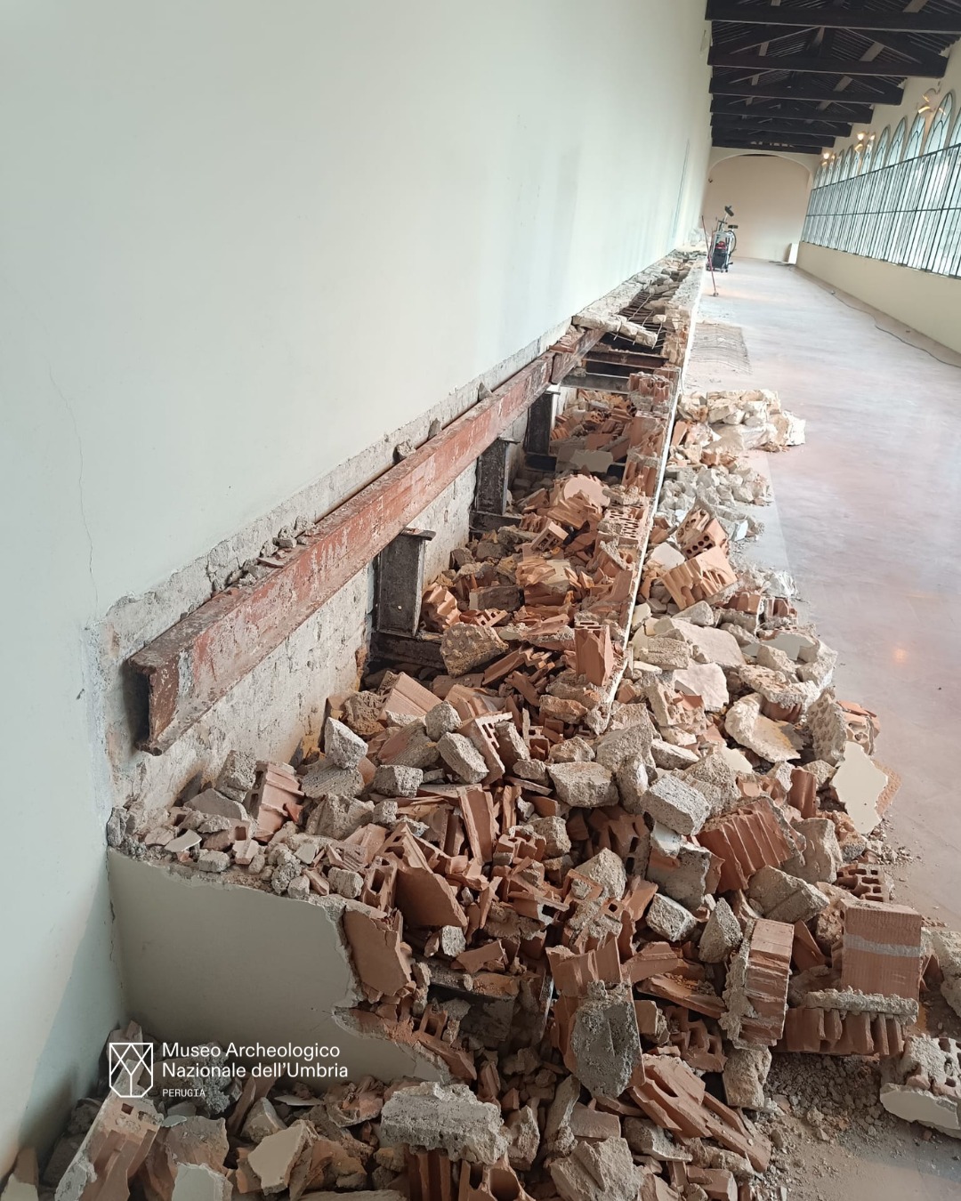 Il secondo gruppo di interventi documentati riguarda invece il consolidamento del muro ovest del chiostro. Qui si è intervenuti sulle murature e sui rivestimenti, con opere di rinforzo mirate a migliorare la tenuta strutturale e la risposta antisismica dell’edificio. Anche in questo caso, il cantiere lavora in profondità, intervenendo non solo sulla superficie visibile ma sull’ossatura stessa del complesso.