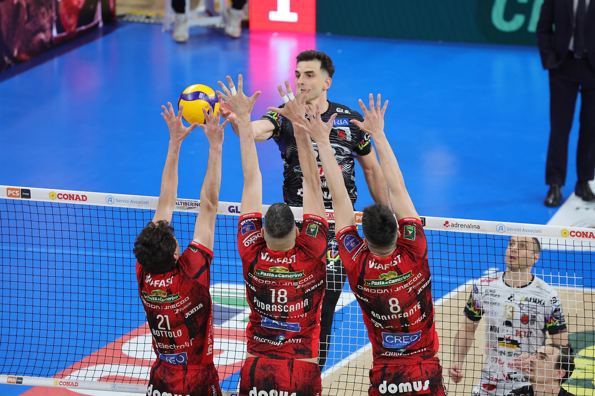 Le cifre: PERUGIA: b.s. 15, ric.pos. 47%, ric.prf. 32%, attacco 55%, muri 7. CIVITANOVA: b.s. 15, ric.pos. 40%, ric.prf. 21%, attacco 46%, muri 4.