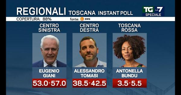 Secondo il primo exit poll del Consorzio Opinio Italia per Rai, con una copertura del campione del 81%, alle elezioni regionali in Toscana, il presidente della Regione uscente, candidato del campo largo di centrosinistra, Eugenio Giani, è al 52-56% mentre il sindaco di Pistoia Alessandro Tomasi, candidato per il centrodestra, è al 39-43%. Antonella Bundu, sostenuta da Toscana Rossa, la lista che mette insieme Rifondazione comunista, Potere al Popolo e Possibile, è al 4-6%.