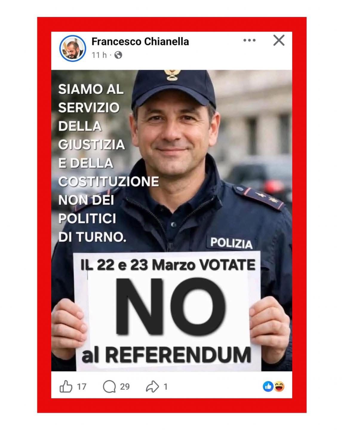 Il sottosegretario di Stato al Ministero dell'Interno si riferisce all'immagine condivisa su Facebook da Francesco Chianella, che ritrae un poliziotto con in mano un cartello con su scritto: "Il 22 e 23 marzo votate No al referendum". E continua: "Siamo al servizio della giustizia e della Costituzione, non dei politici di turno".