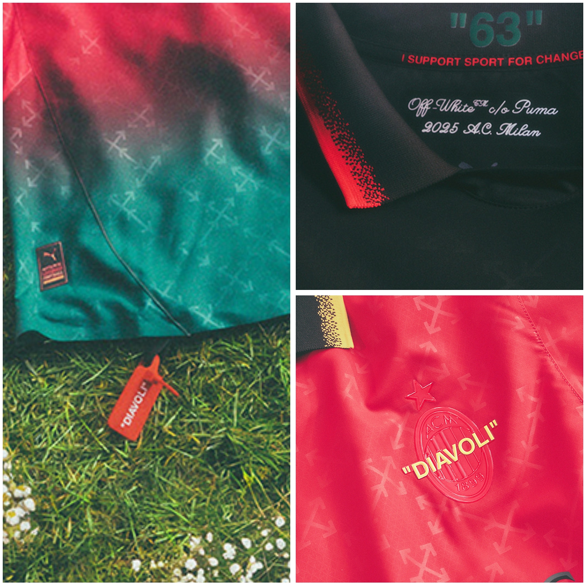 Al centro di questa collezione esclusiva c'è il concetto di Dreamland. I dettagli presenti in entrambe le divise sono verdi e gialli, a comporre la bandiera panafricana. La maglia omaggia la black excellence e il potere dei sogni, strumento di trasformazione. Ogni singolo dettaglio ha un senso: nel colletto è stampato il numero 63 tra virgolette, tratto distintivo di Off-White, a ricordare sia la prima Coppa dei campioni del club, alzata da Cesare Maldini, ma anche il celebre discorso di Martin Luther King I have a dream.