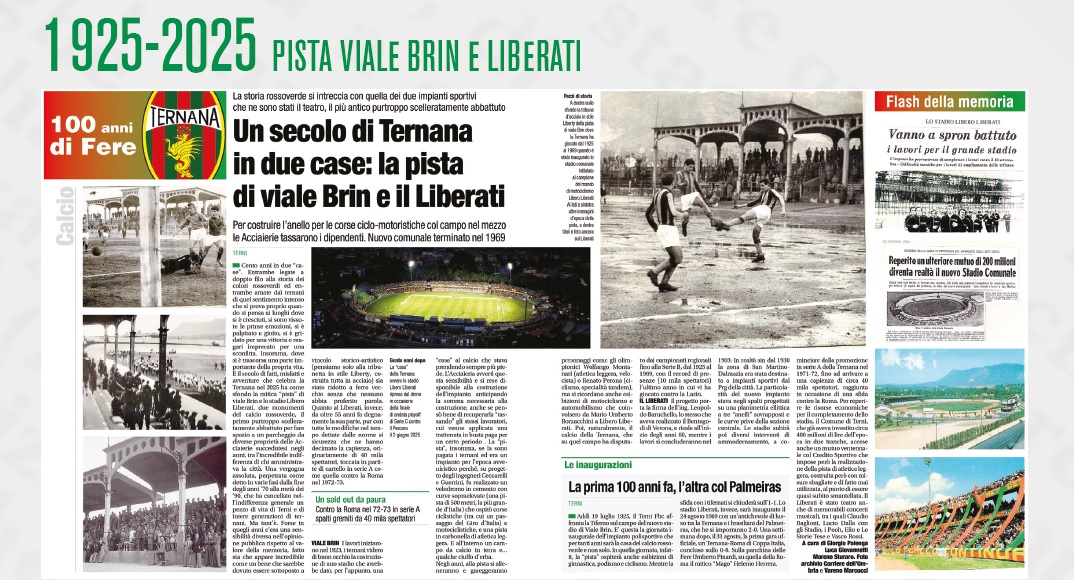Una fusione che per convenzione viene considerata la nascita di quella che è la Ternana attuale, anche se a dire il vero le prime esperienze di calcio nella città dell’acciaio risalgono ai primi del ’900. E proprio... all’acciaio, leggi la Grande Fabbrica dove veniva (e viene) prodotto, che è legata a doppio filo la storia del football rossoverde, a cominciare dalla costruzione della cosiddetta “pista” di viale Brin, ovvero quello stadio che ha ospitato le partite della Ternana fino al 1969, quando venne inaugurato l’attuale Liberati. Ed è proprio alle due “case” dei colori rossoverdi che sono dedicate le prime pagine del Mag che troverete domani in edicola nel quale, come detto, abbiamo ripercorso - con pagine uscite ogni mercoledì, dallo scorso marzo alla metà di questo settembre - gran parte delle tappe più significative di un secolo di Fere.