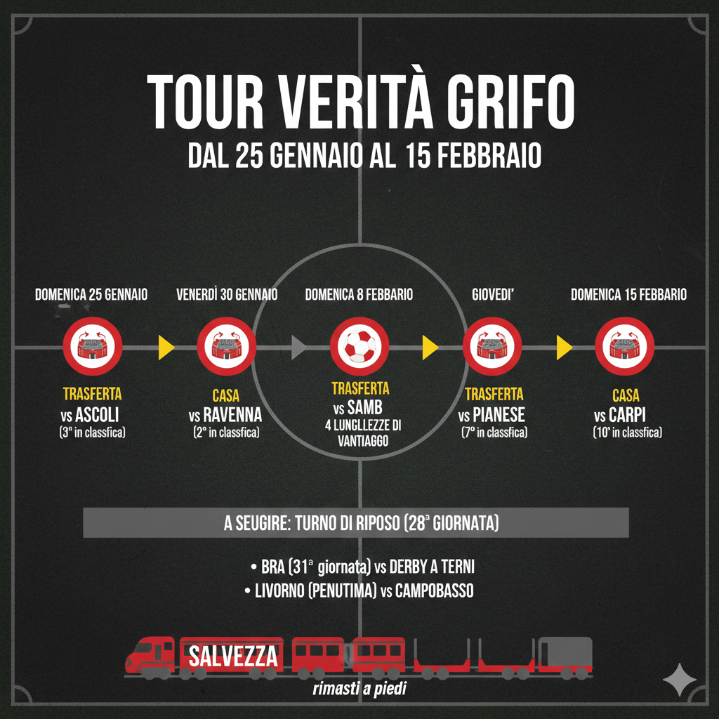IL RIPOSO A quel punto il Grifo dovrà tirare una linea e fare i primi conti, visto che nel weekend successivo, (28esima giornata), osserva il turno di riposo mentre le rivali avranno altri 3 punti a disposizione. È vero che tutte poi si fermeranno nel finale: il Bra alla 31esima quando il Perugia affronta il Pontedera, la Samb alla 36esima e in calendario c’è il derby a Terni, mentre il Livorno alla penultima con il Grifo che ospita il Campobasso. È altrettanto, però, vero che osservando prima il riposo e vedere le rivali troppo distanti potrebbe diventare una ulteriore zavorra psicologica. Per questo nelle prossime 5 gare è essenziale muovere più possibile la classifica. Ma senza fare tabelle. Solo giocando una partita alla volta.