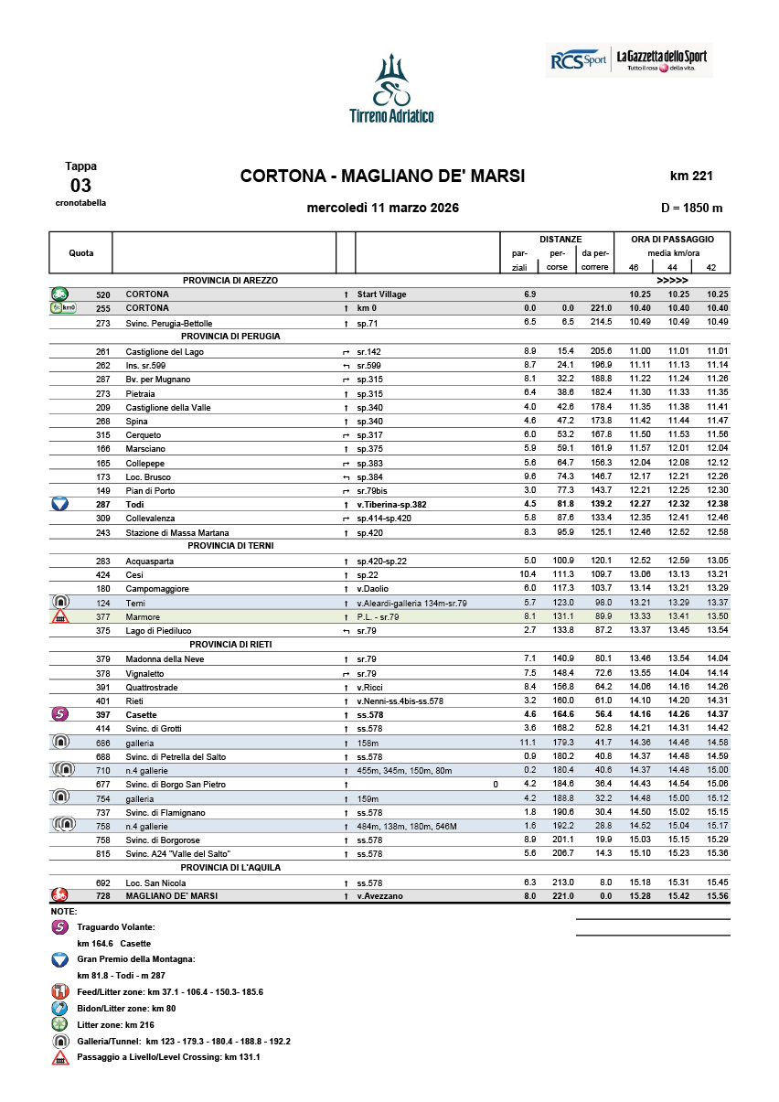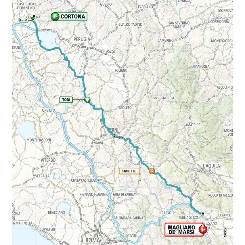 Tappa molto lunga e leggermente ondulata. Si snoda in un susseguirsi di lievi saliscendi, tra i quali si possono segnalare Todi e le Marmore. Finale veloce sempre leggermente a salire per gli ultimi 15 km fino al rettilineo finale (circa 3%). Ultimi pianeggianti praticamente rettilinei. Dopo l’ingresso in Magliano de’ Marsi la strada sale leggermente (circa 2%) fino al rettilineo finale su asfalto.