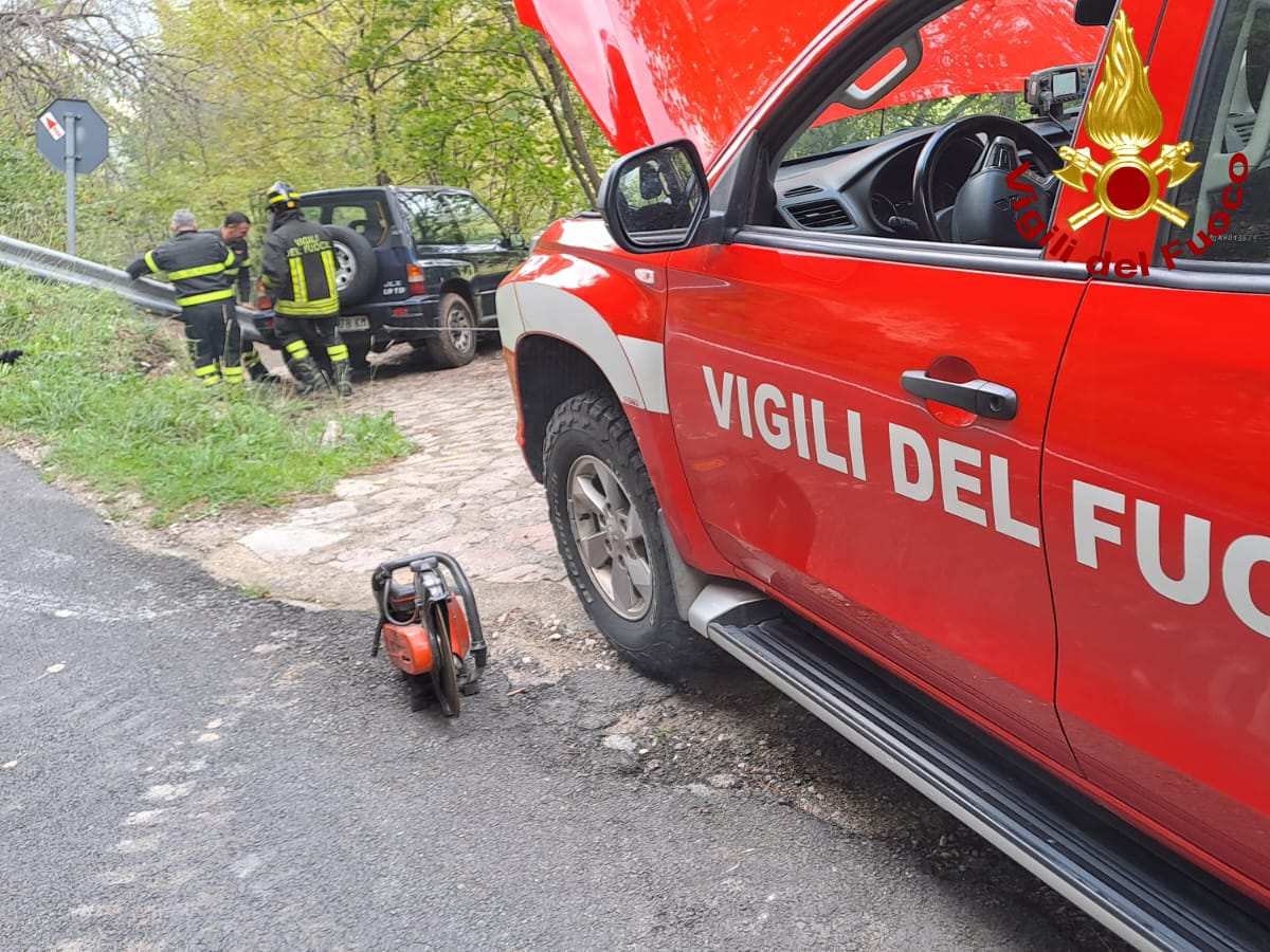 Esce di strada e si schianta incastrandosi tra due guardrail. Incidente stradale in località Prati di Stroncone, nel comune di Terni, nel pomeriggio di sabato 26 ottobre. Sul posto, lungo il sentiero francescano, sono intervenuti i vigili del fuoco verso le ore 16.