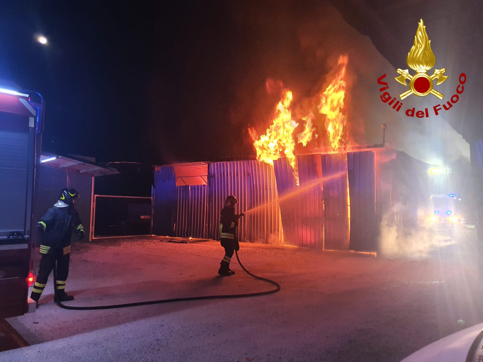 In fiamme un capannone adibito ad officina, all'interno del quale si trovava un camper, oltre a due macchine operatrici e alle attrezzature, compresi fusti di olio e lubrificanti altamente infiammabili.