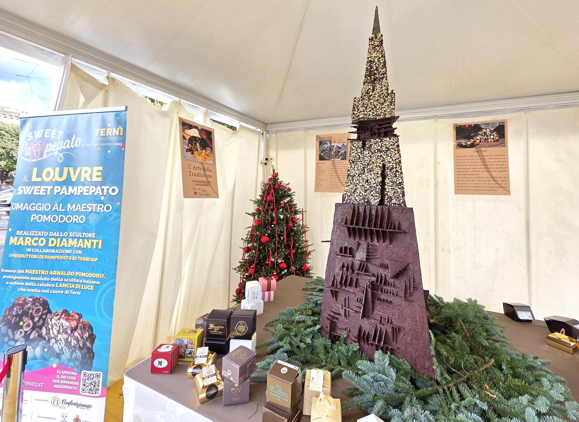Tra i momenti più attesi, la presentazione della scultura ispirata alla Lancia di Luce di Arnaldo Pomodoro, interamente riprodotta in pampepato e cioccolato. L’opera, ideata dal docente ternano Marco Diamanti e realizzata insieme ai produttori Igp, supera i due metri di altezza e pesa circa 20 chilogrammi, trasformando un angolo di piazza Tacito in un’inedita galleria d’arte dolciaria a cielo aperto.
