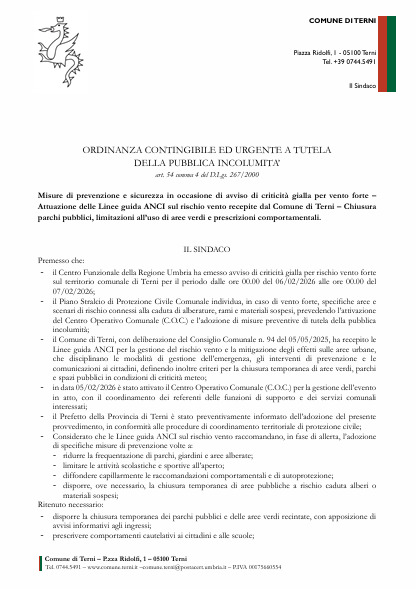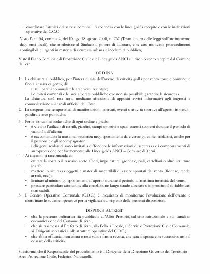 Il sindaco di Terni, Stefano Bandecchi, a seguito del bollettino meteo della Protezione Civile regionale dell'Umbria, ha attivato il Centro operativo comunale (tel. 0744.426000) conallerta meteo gialla(pericolo lieve)per il ventoe firmato l'ordinanza che istituisce i divieti per la sicurezza dei cittadini. In particolare, l'ordinanza dispone: