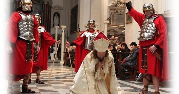 A Terni anche quest’anno in basilica, come da tradizione, gli eventi in onore del Santo patrono si apriranno con la rievocazione storica del martirio di San Valentino. Si tratta di una rievocazione degli ultimi giorni di vita di San Valentino, in particolare l’arresto e il processo sommario subito prima dell’esecuzione della condanna a morte per decapitazione, accaduta nel 273 d.C. di notte lungo la via Flaminia al miglio 63, pronunciata dall’imperatore romano Augusto il Gotico. Quest’anno le due rappresentazioni si terranno sabato 7 e sabato 21 febbraio alle ore 18.30 nella basilica di San Valentino.