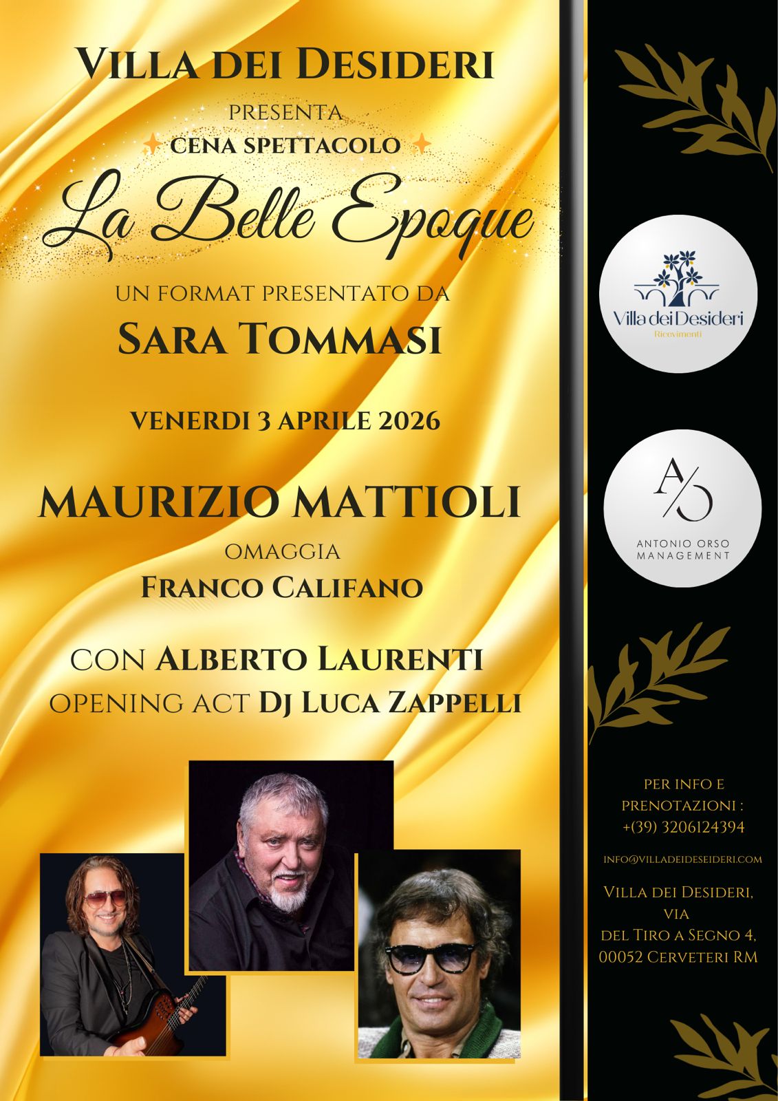 Venerdì 3 aprile si terrà nella suggestiva location in provincia di Roma una splendida cena di gala, presentata da Sara Tommasi, con special guest Maurizio Mattioli in concerto con Alberto Laurenti & Band per un omaggio a Franco Califano.