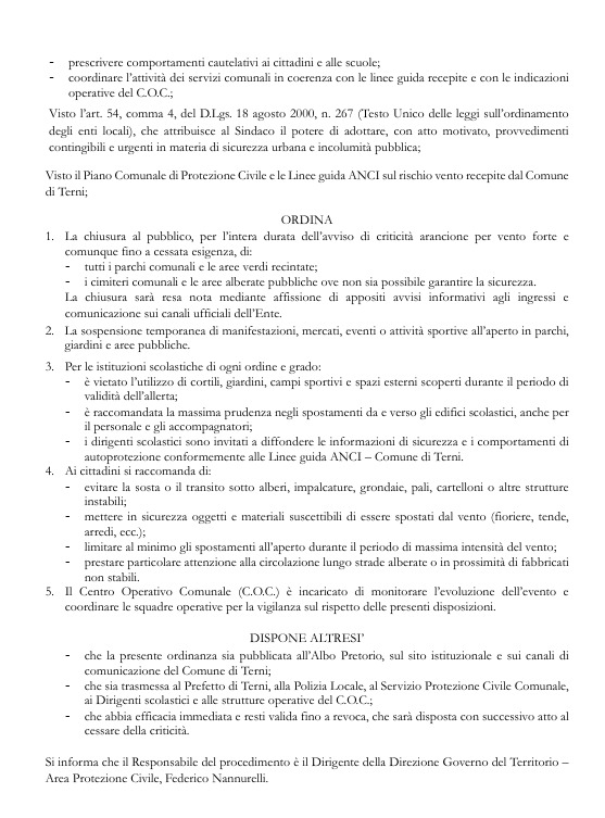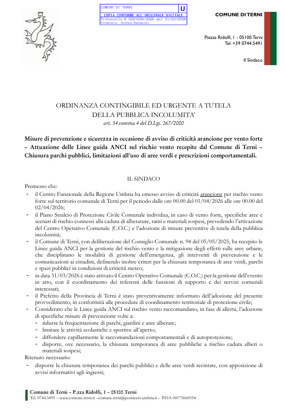 Con l'allerta meteo emessa dal Centro Funzionale della Regione Umbria con un avviso di criticità “arancione” per rischio vento forte per la giornata di mercoledì 1 aprile 2026, il Comune di Terni ha provveduto ad emettere una ordinanza urgente per disporre la chiusura al pubblico di tutti i parchi comunali e le aree verdi recintate, dei cimiteri e delle aree alberate pubbliche ove non sia possibile garantire la sicurezza, nonché la sospensione temporanea di manifestazioni, mercati, eventi o attività sportive all'aperto in parchi, giardini e aree pubbliche.